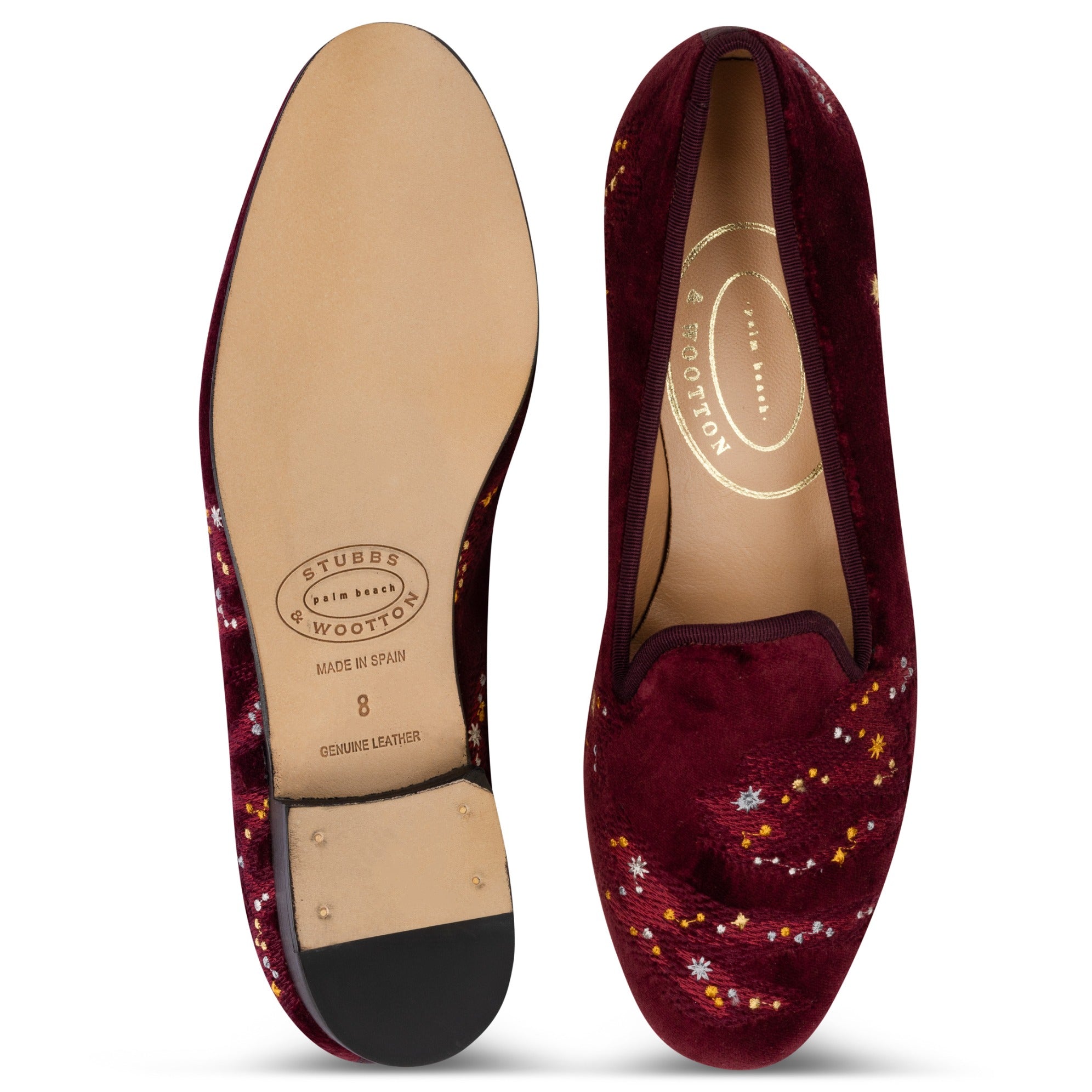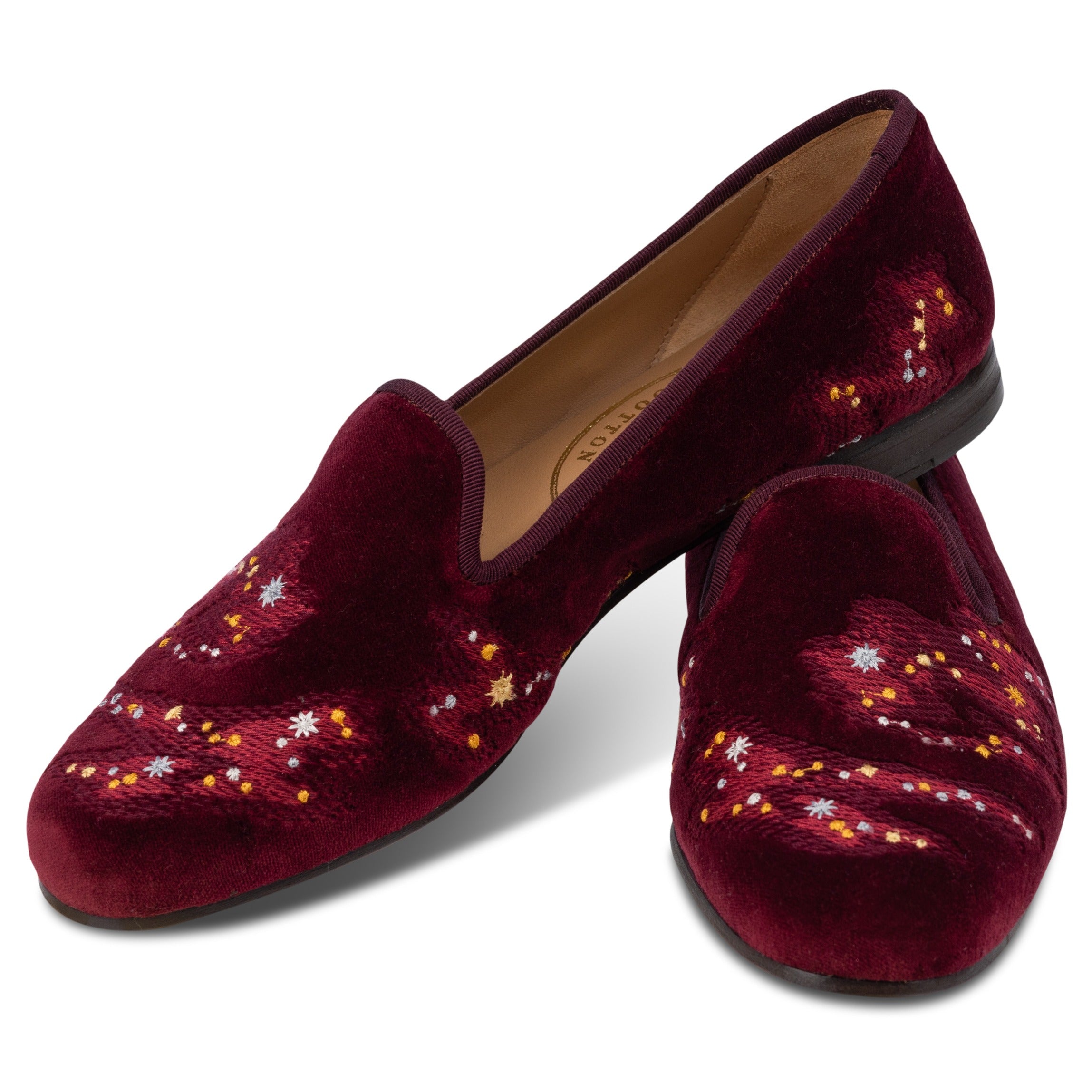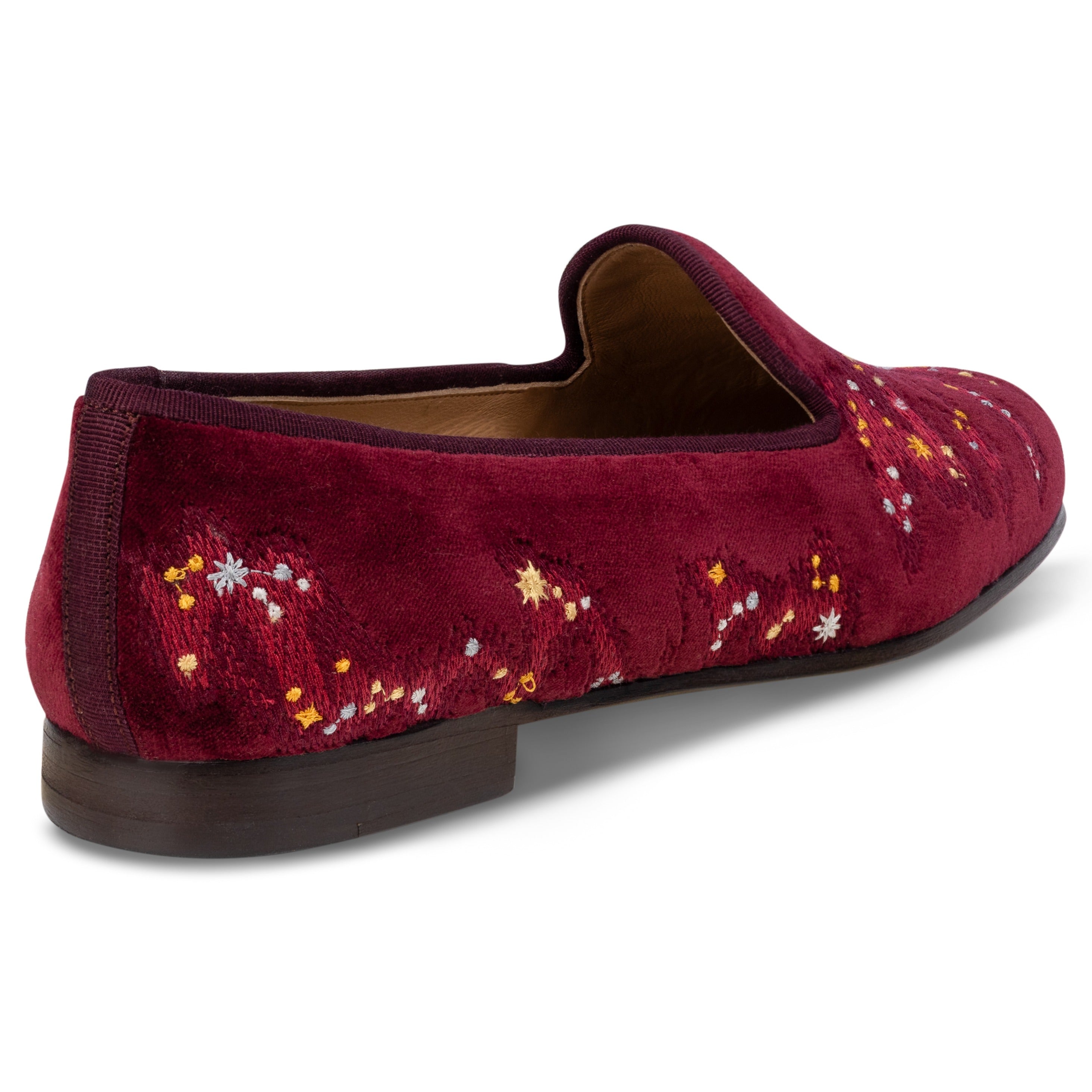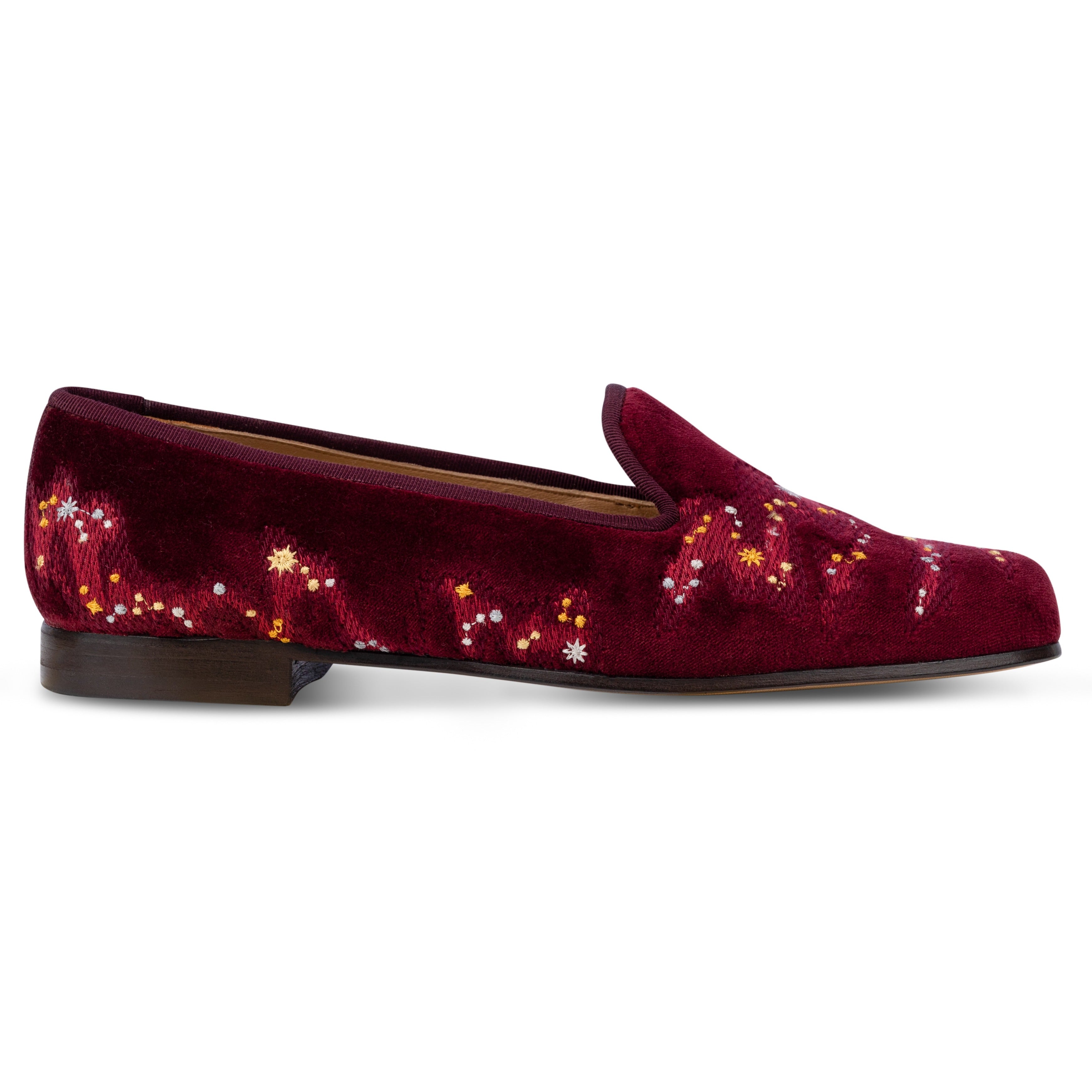 Discover the stars with these festive slippers, easily paired with your winter wardrobe. A smattering of constellations and star dust in shades of gold and silver adorn this velvet slipper. The pair is crafted from a dense rich cotton velvet, and trimmed in matching silk grosgrain.