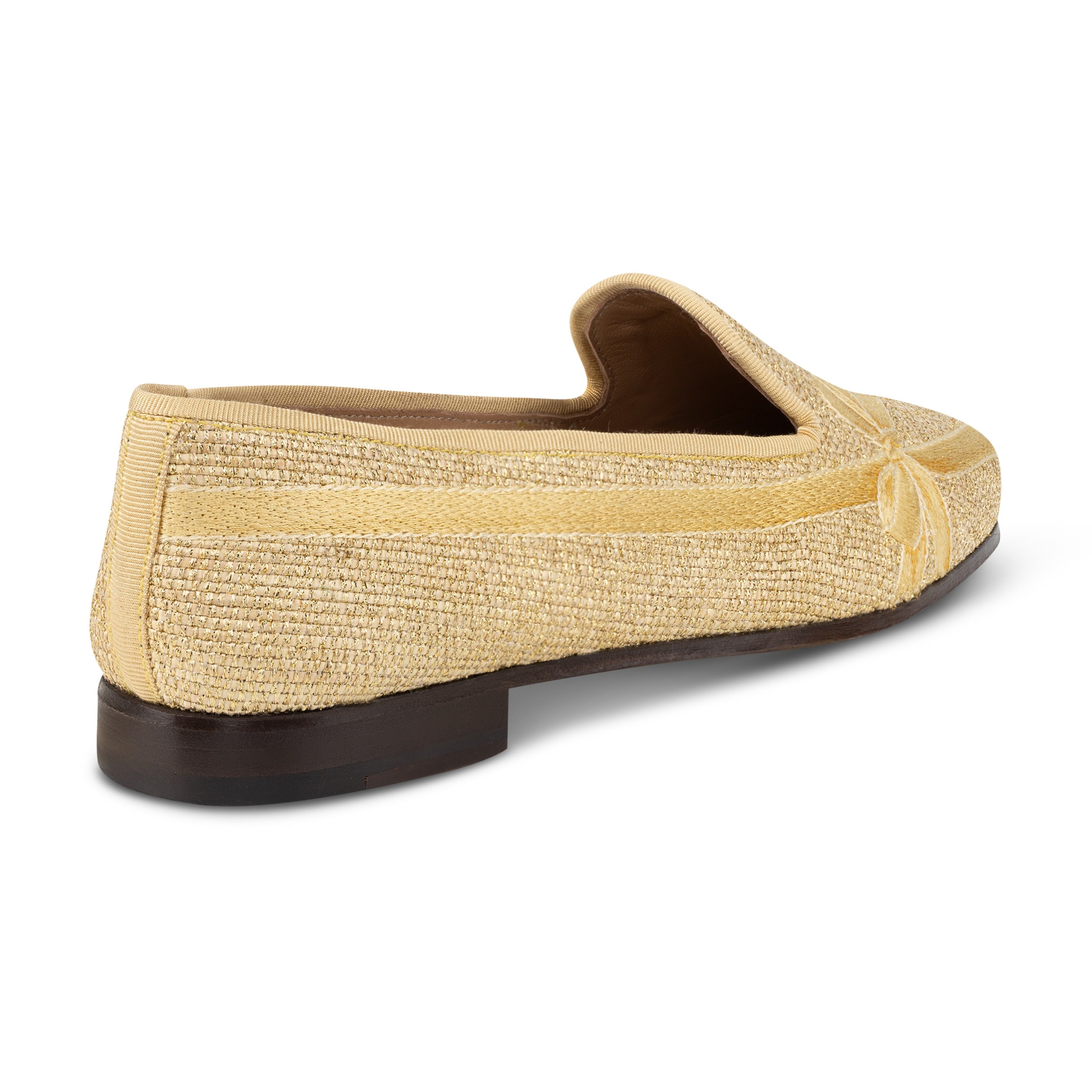 Our Wrapped raffia gold slipper is made with a straw raffia woven with gold filament, and tonal silk cotton grosgrain. The embroidery emulates a gold ribbon wrapped present.