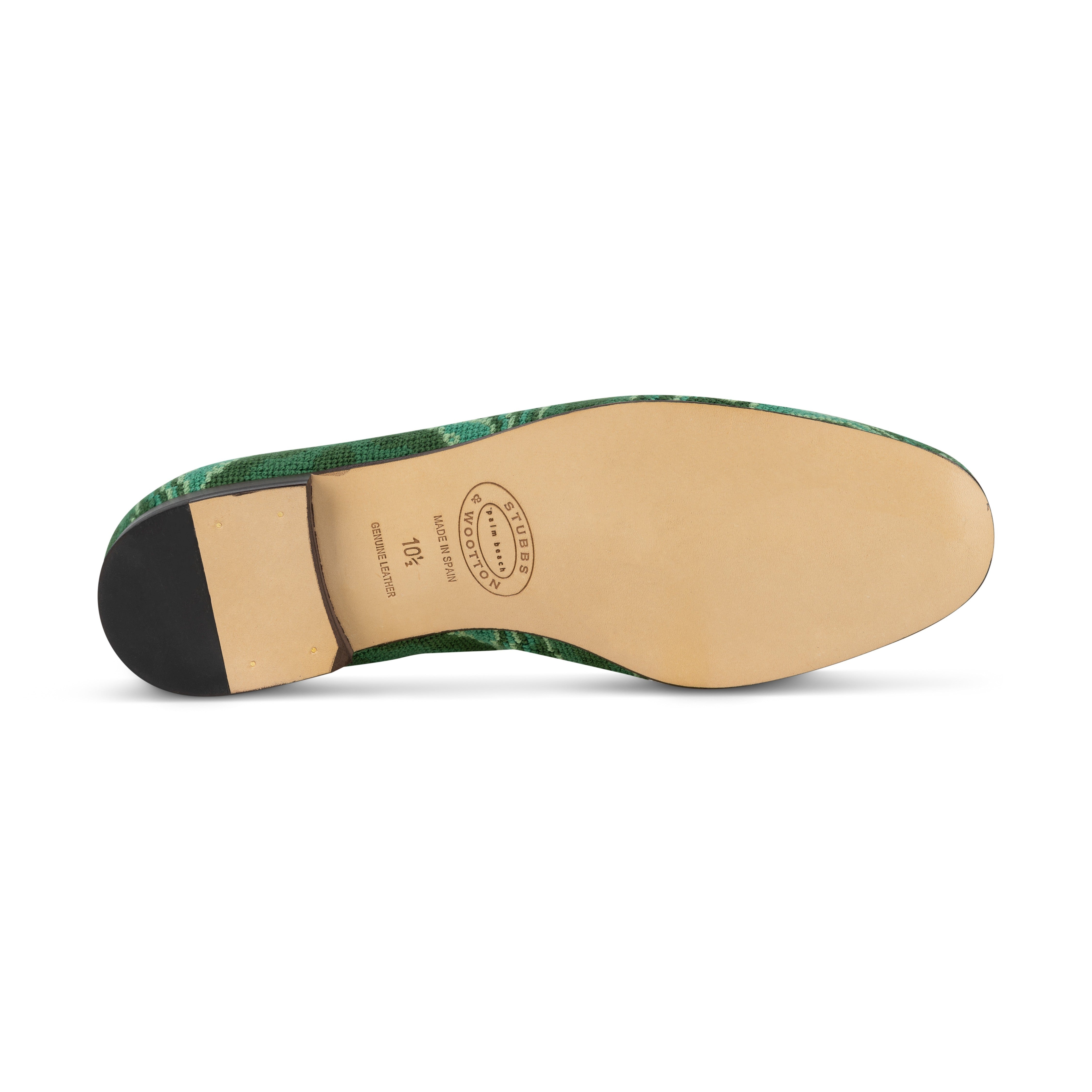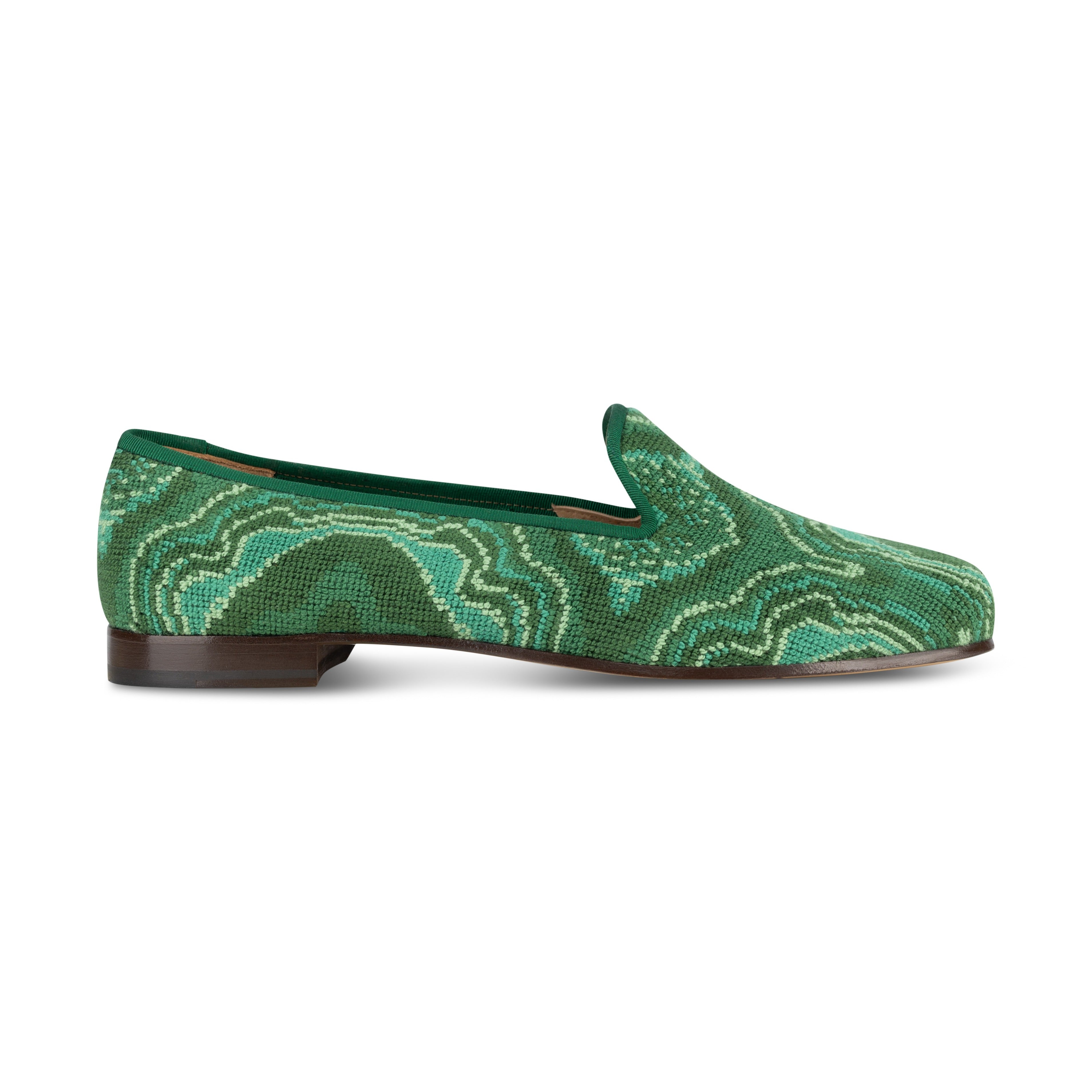 Stubbs & Wootton is the velvet slipper, the embroidered slipper, and the needlepoint slipper. Working with our Belgian partners, we have woven a limited run of our newest needlepoint designs in Malachite and Lapis.