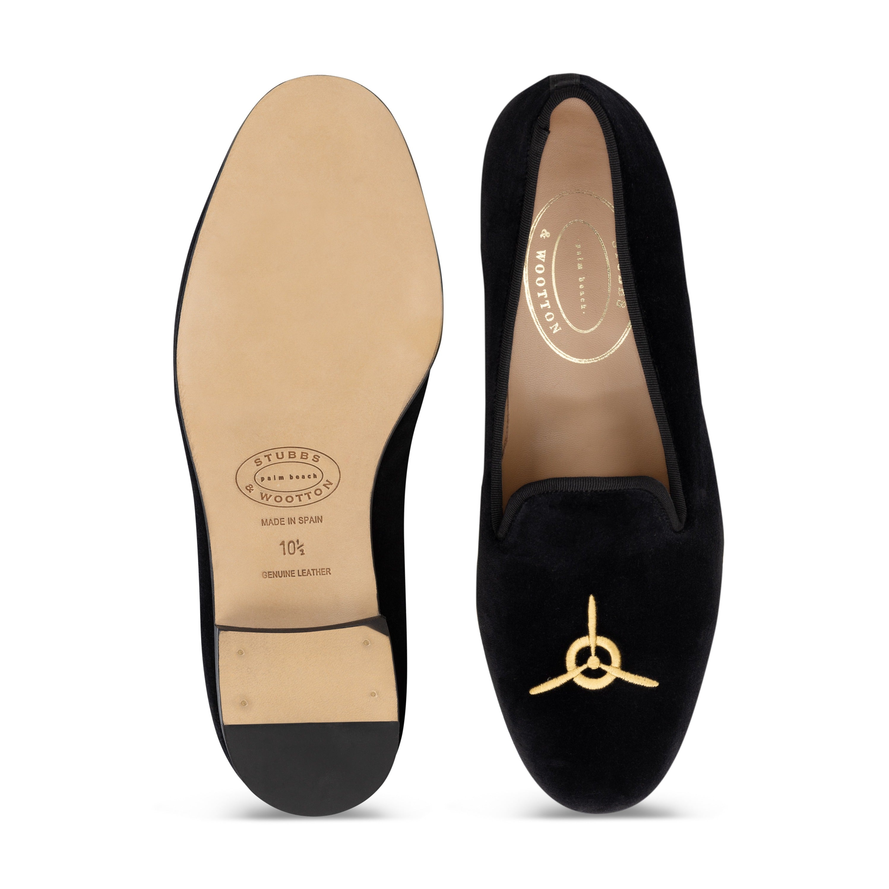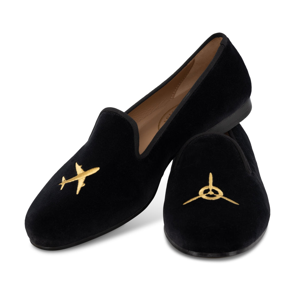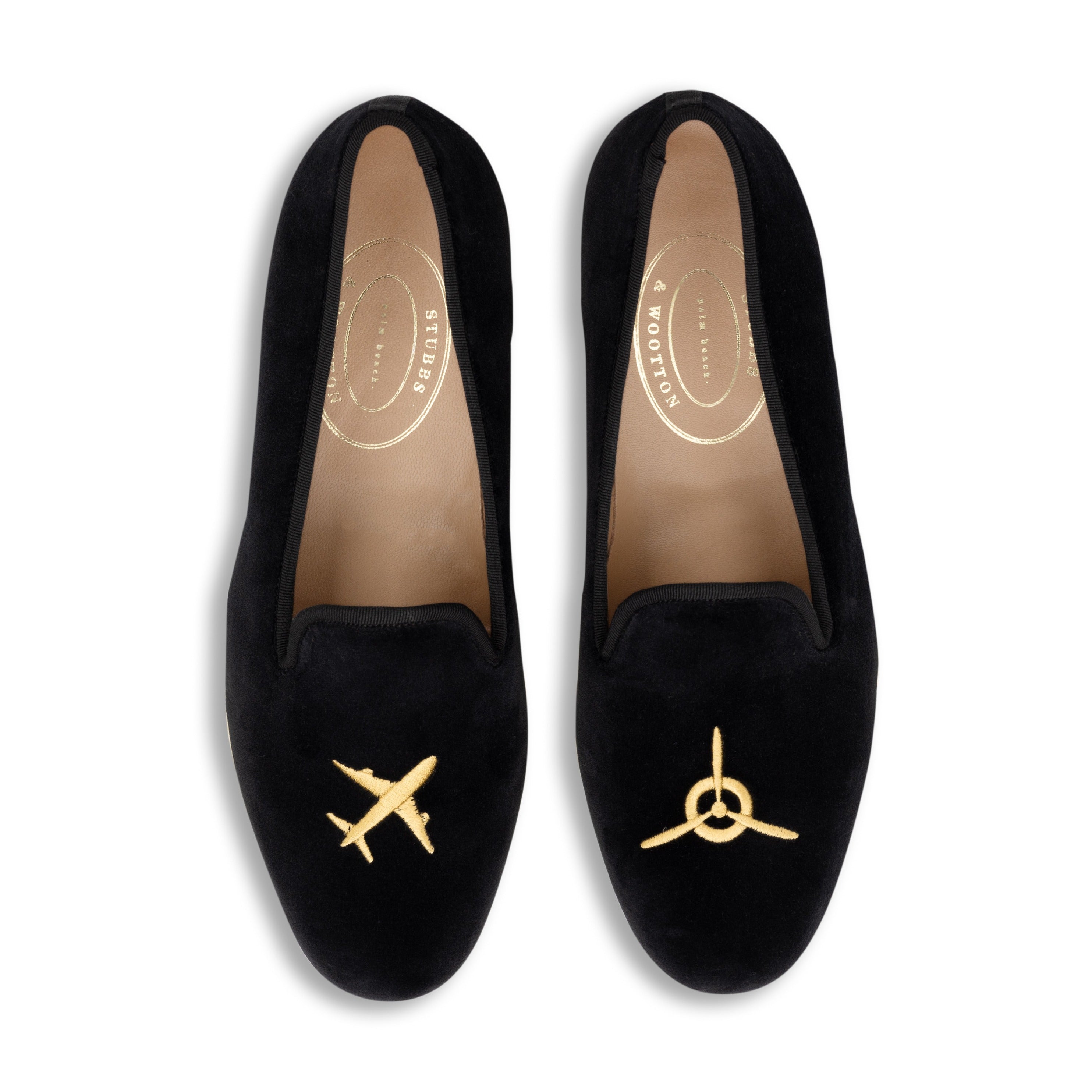 Our travel velvet slipper is made with our cotton velvet, and tonal silk cotton grosgrain. The embroidery captures a plane and propeller in metallic woven cotton threads.