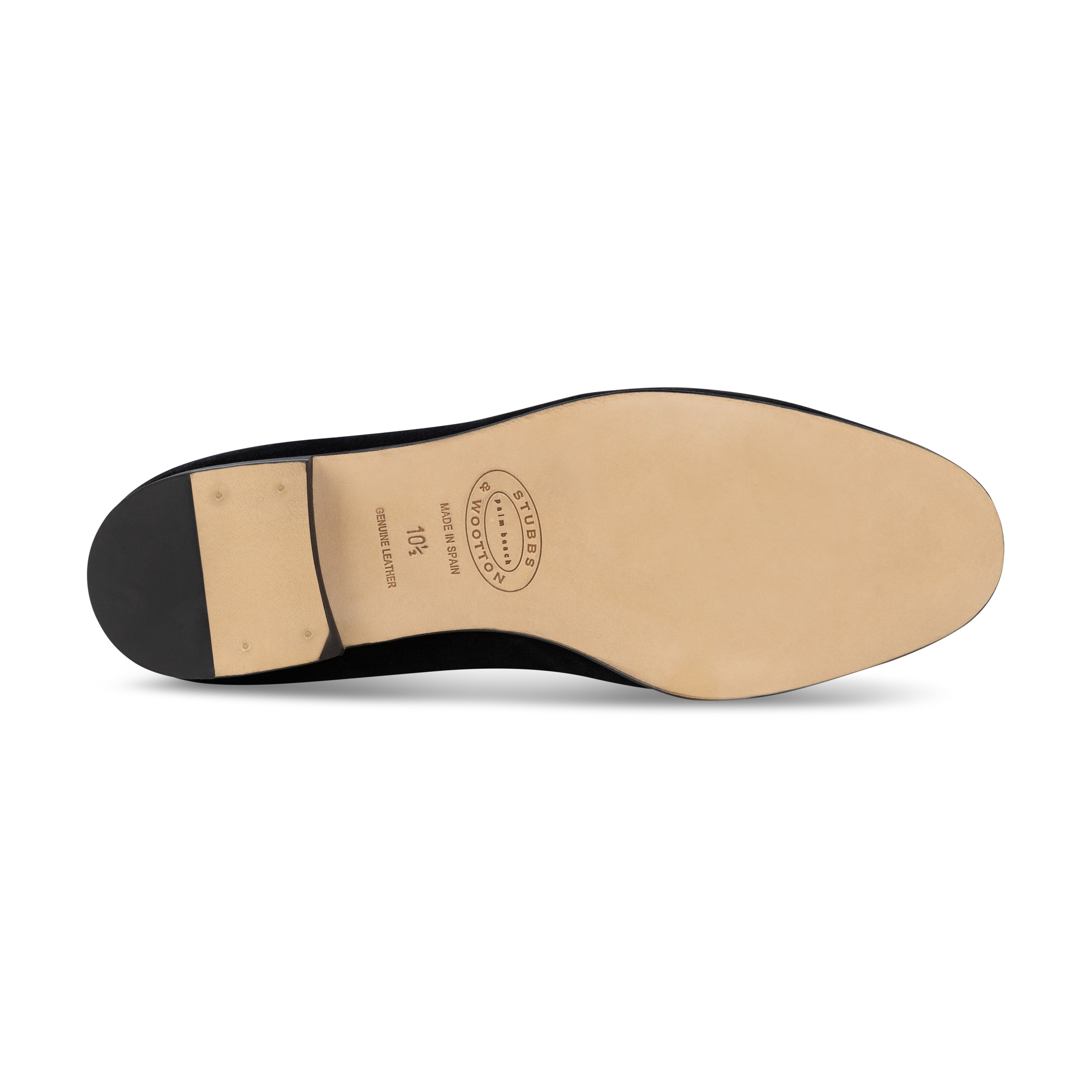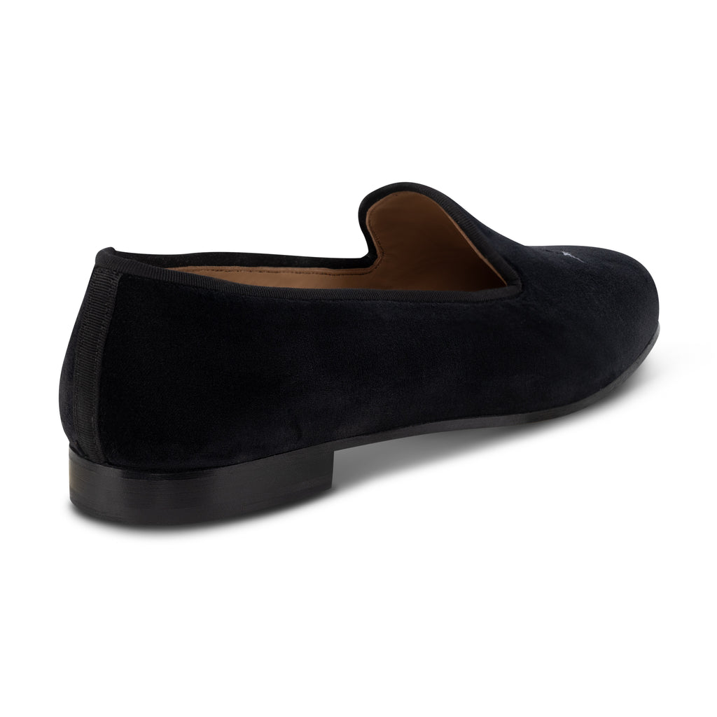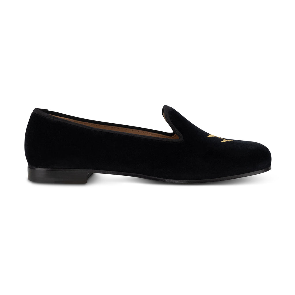 Our travel velvet slipper is made with our cotton velvet, and tonal silk cotton grosgrain. The embroidery captures a plane and propeller in metallic woven cotton threads.