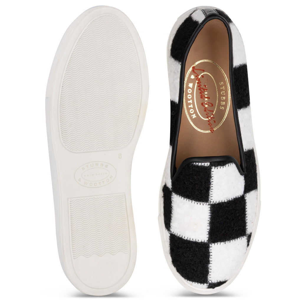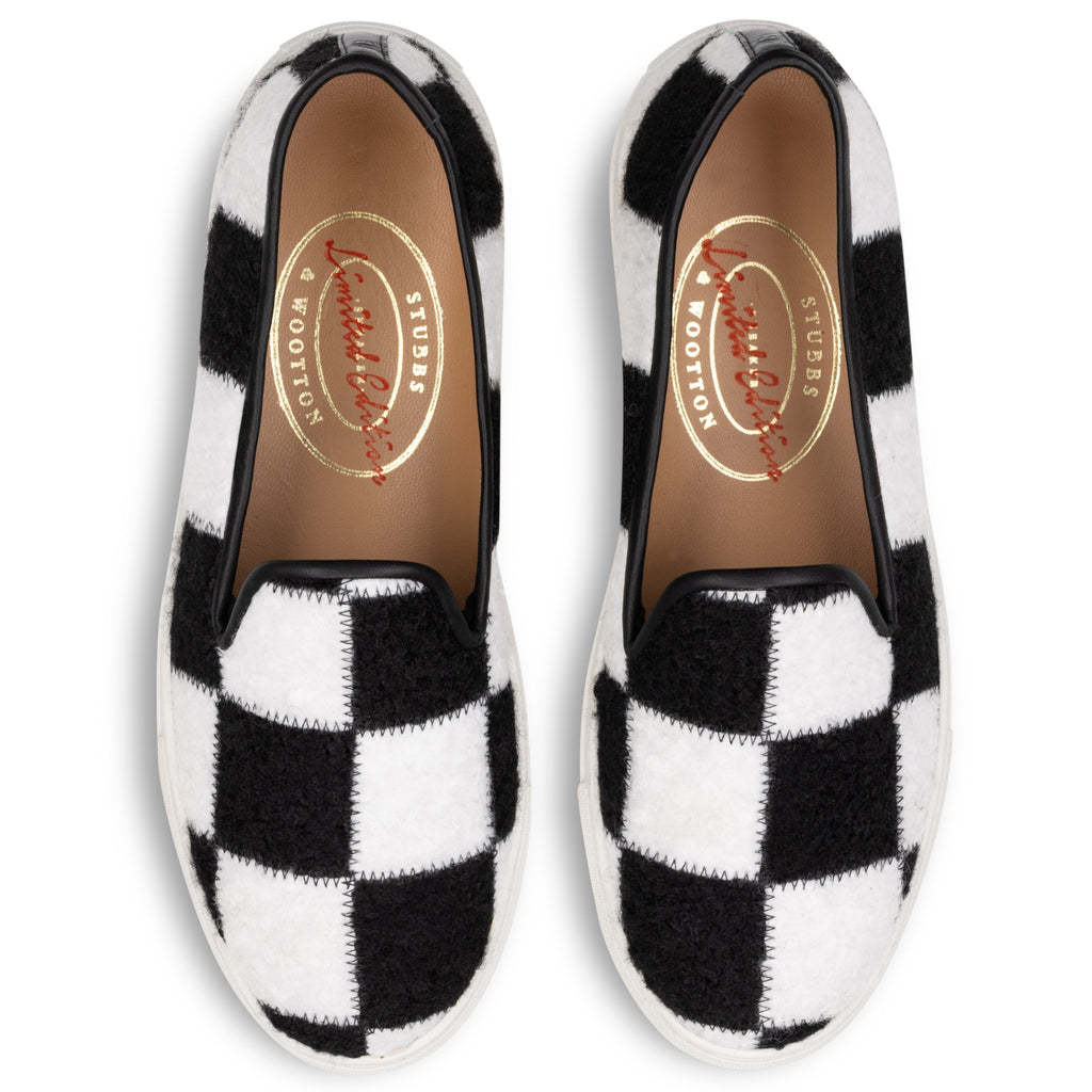 Introducing Teddy – crafted in our new Teddy Bouclé fabric and made to order for a limited time. Warm, whimsical, and quietly irreverent, with embroidered bears and skulls, adding just the right touch of mischief to winter’s coziest luxury. The capsule also debuts our checkered Teddy Bouclé slip-on – a playful, skate-inspired silhouette elevated through rich texture and refined craft.