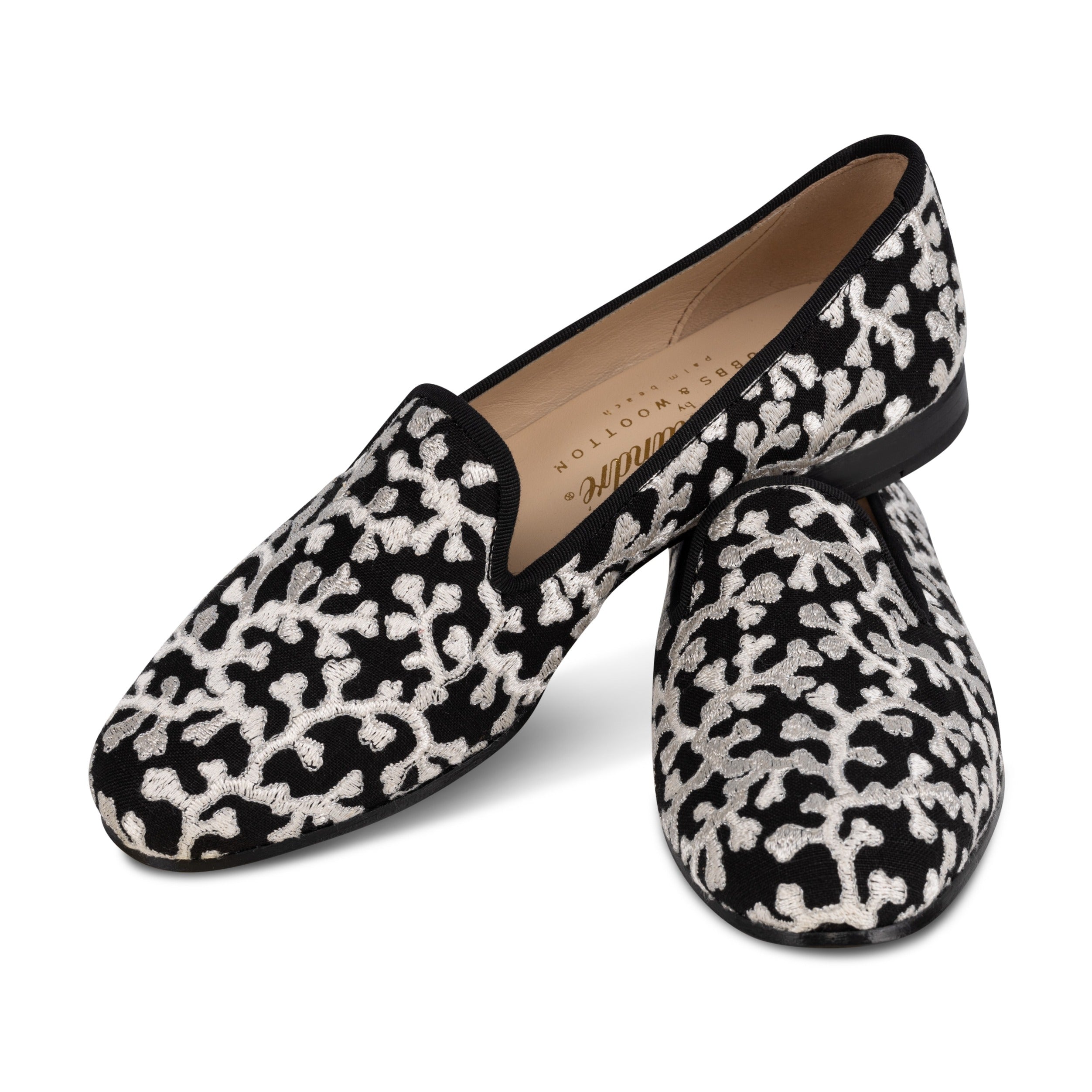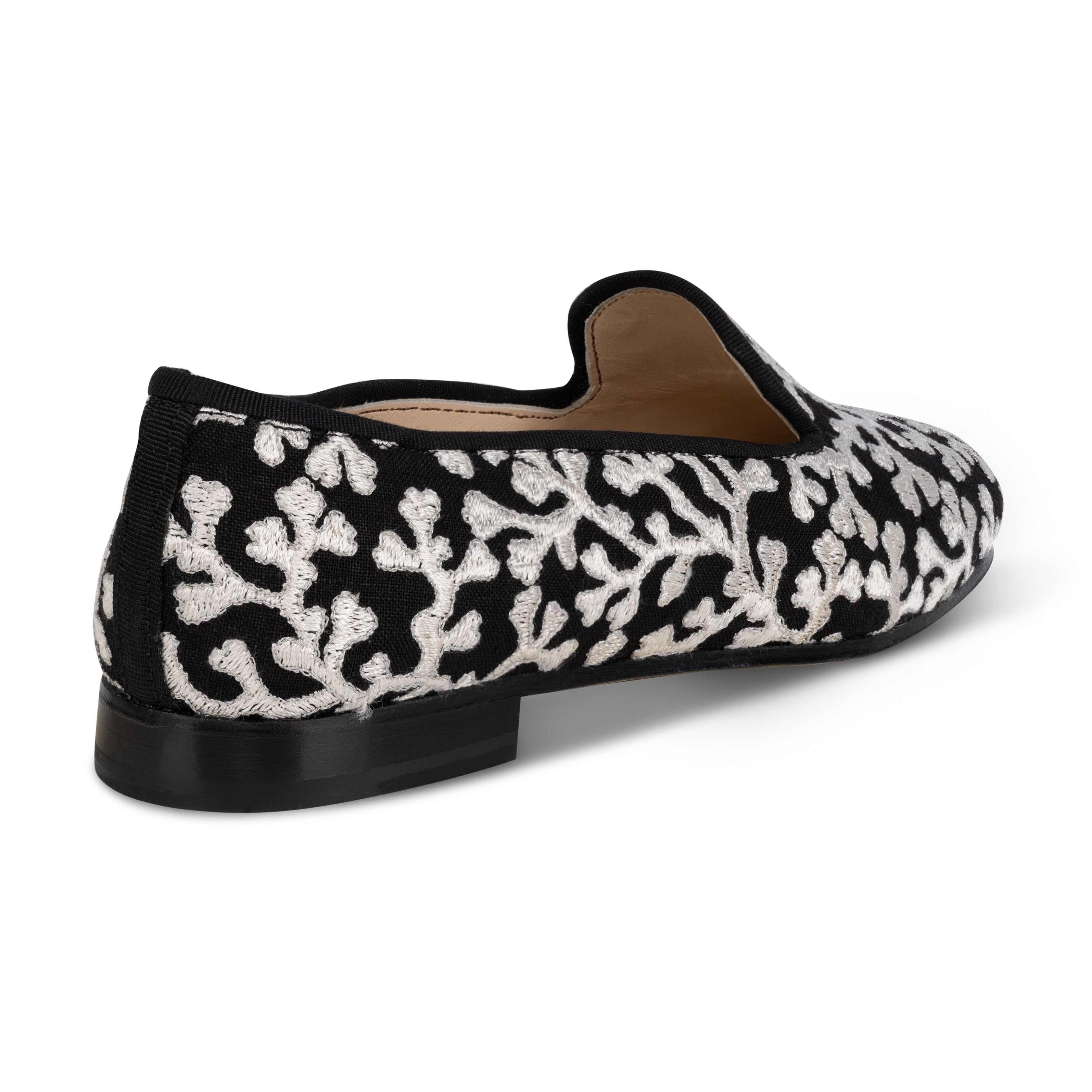 Our Coral Bay series highlights our deep relationship with the house of Scalamandré. The embroidered linen fabric faintly catches the light with it's metallic filament thread outlining the intricate coral. The slipper is trimmed in cotton silk grosgrain with a stacked black heel.