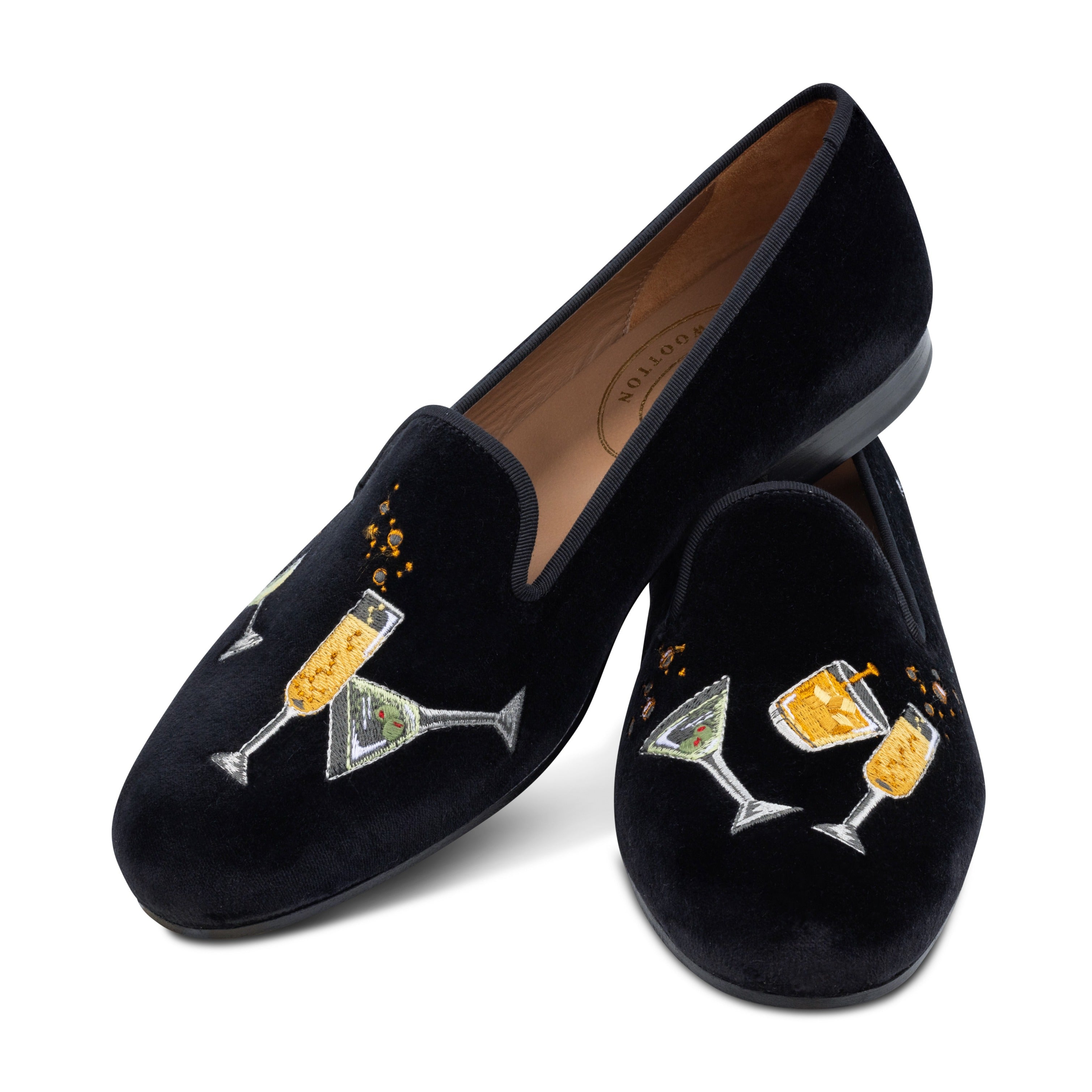 Our Celebrate Velvet Slipper features an assortment of our favorite celebratory concoctions, embroidered on Black Velvet.