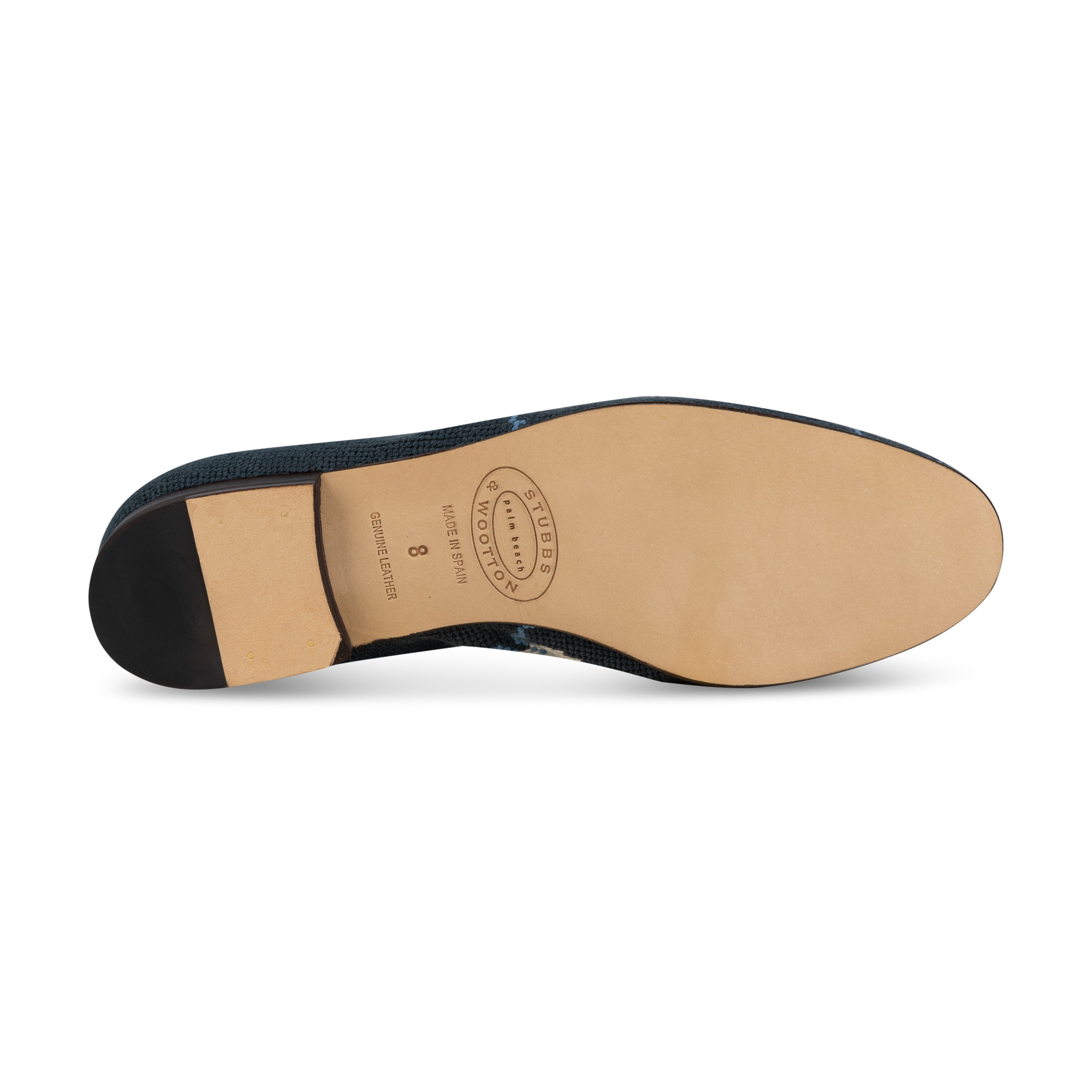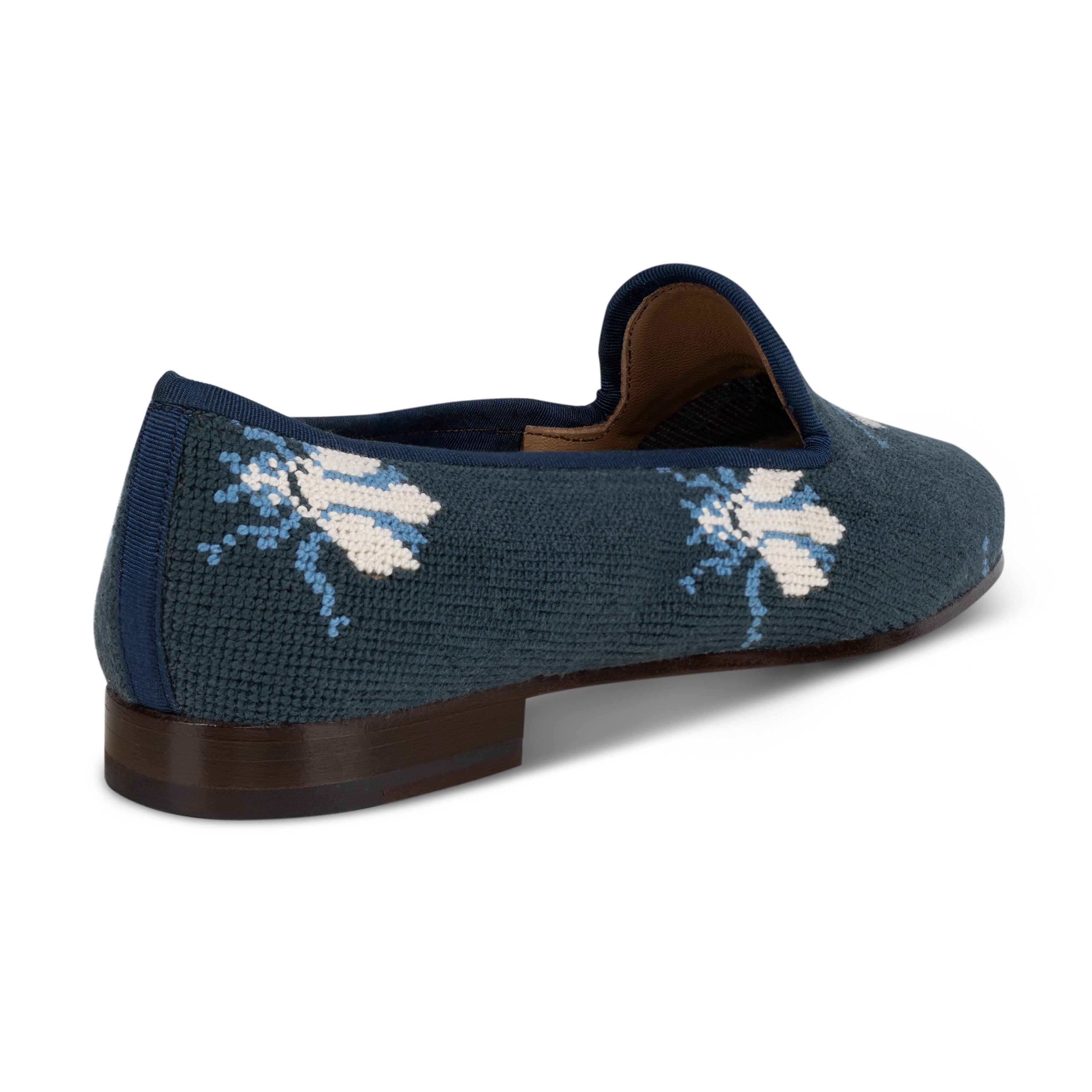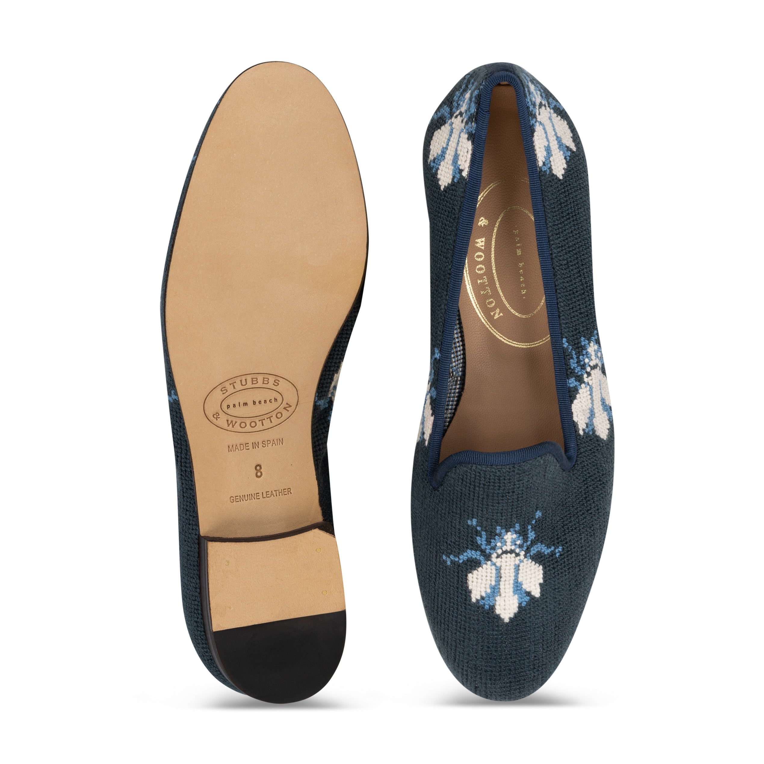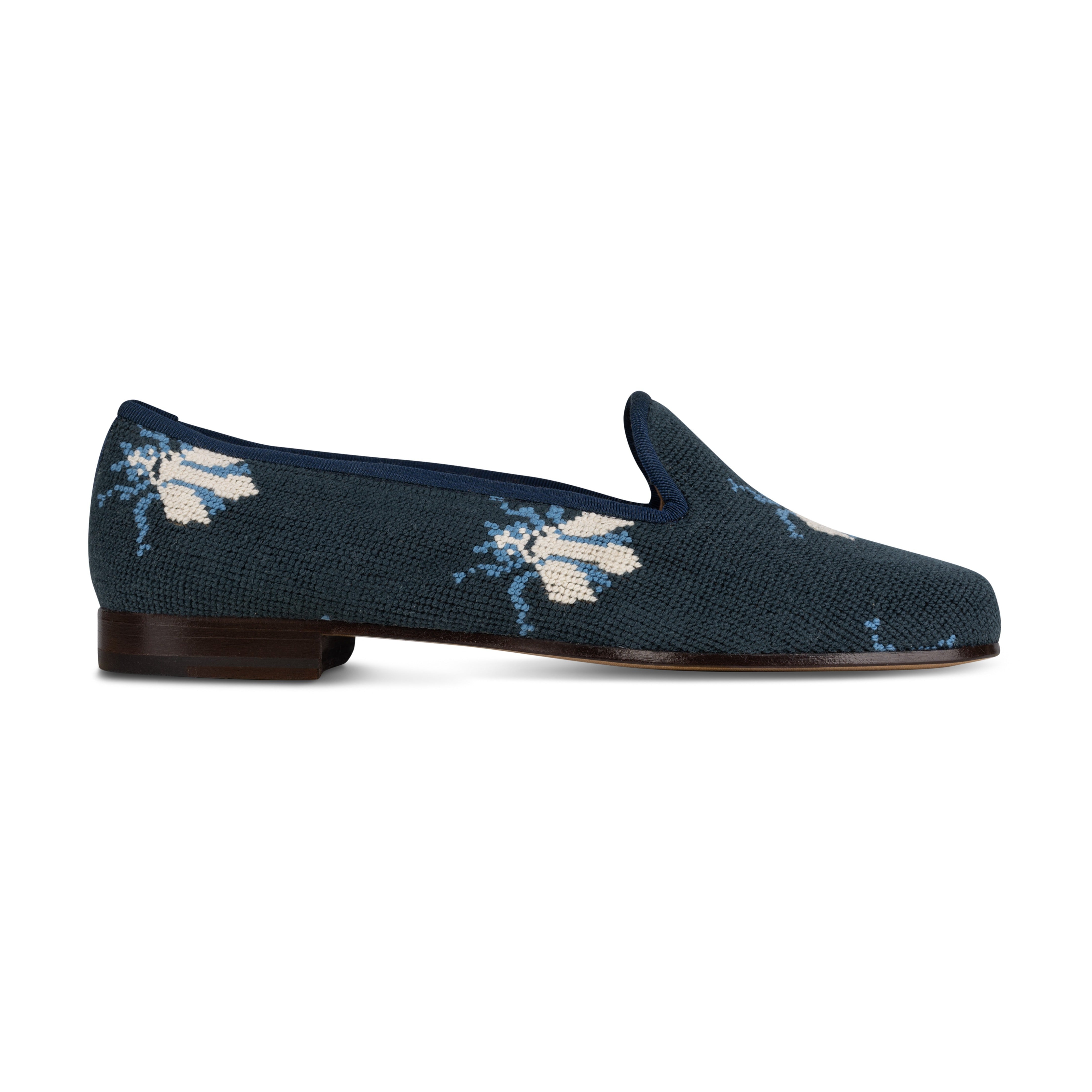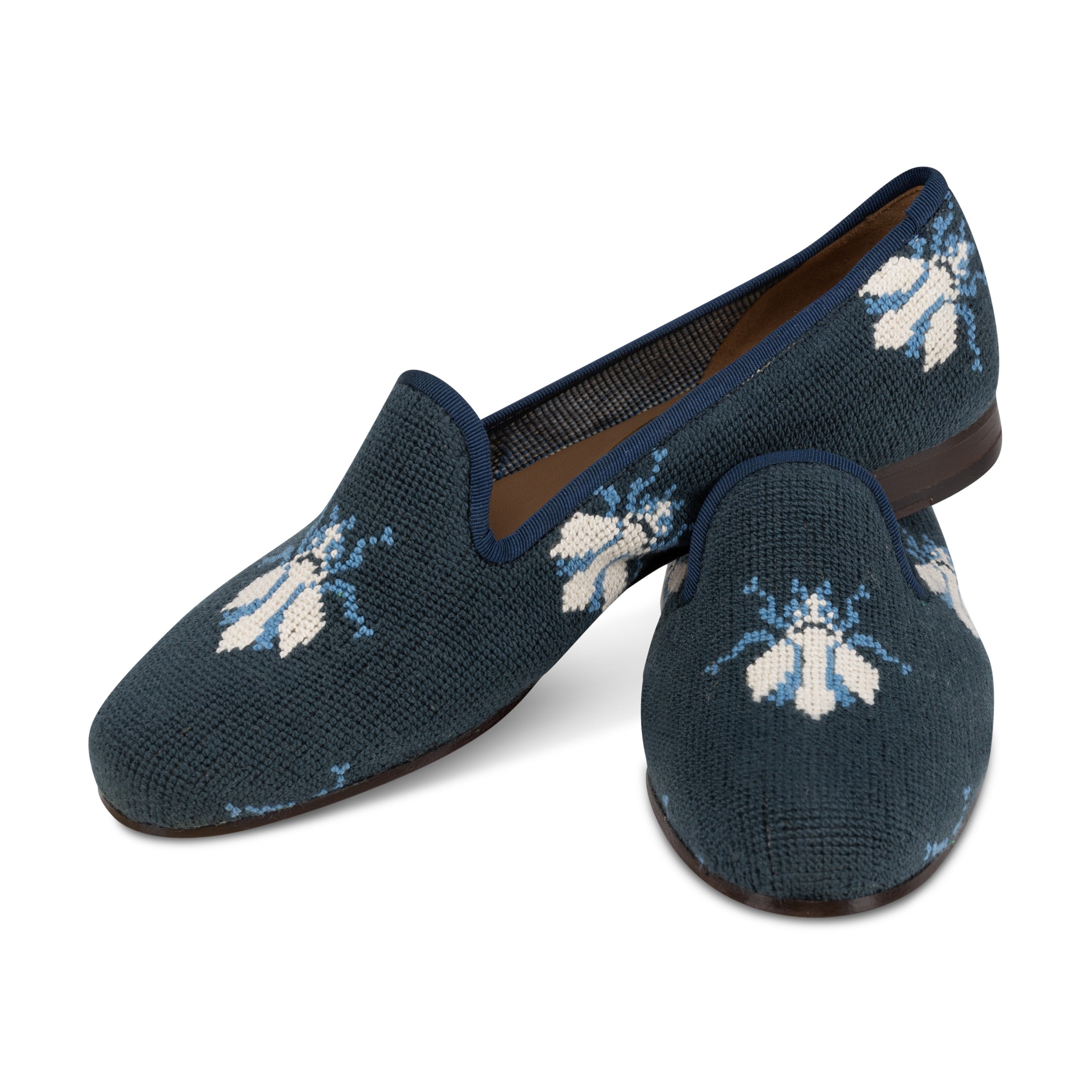 Our Bee navy needlepoint slipper features our custom needlepoint design of repetitive white bees on a navy ground. It is trimmed in a tonal silk cotton grosgrain.