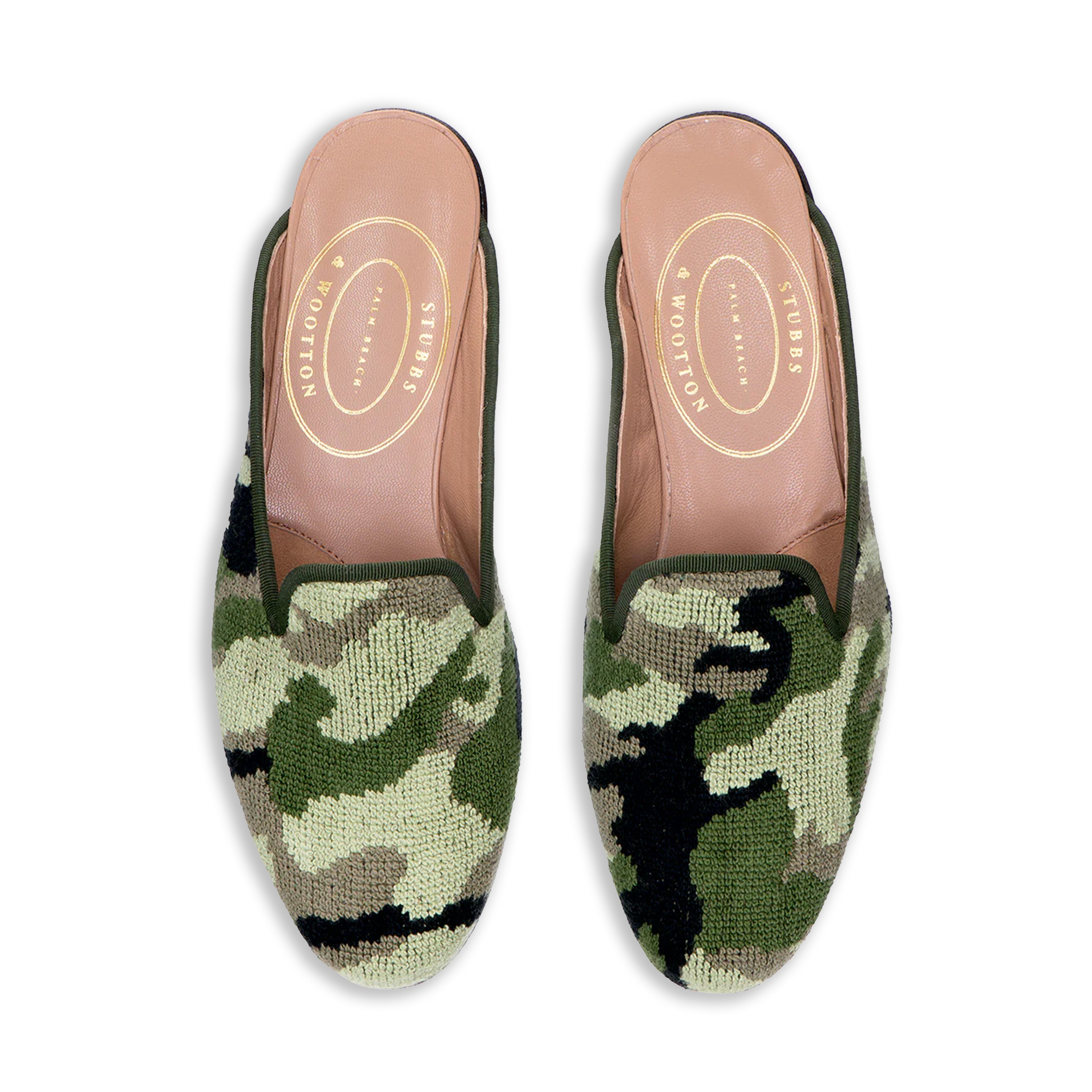 Our Camo Needlepoint Mule features our timeless Camouflage Needlepoint with an Olive Green Grosgrain Trim.