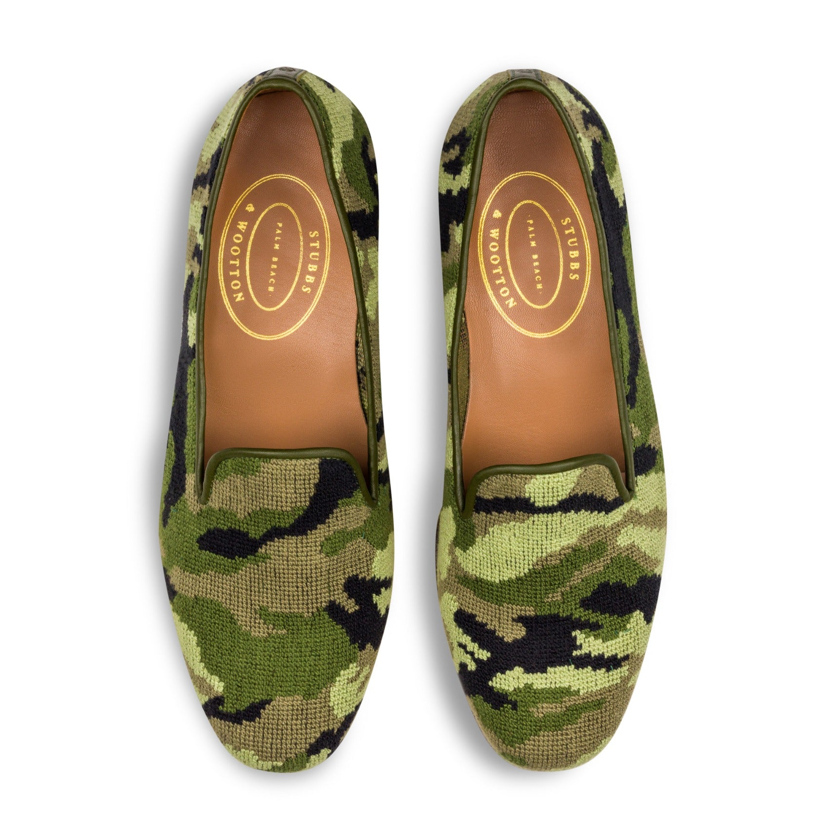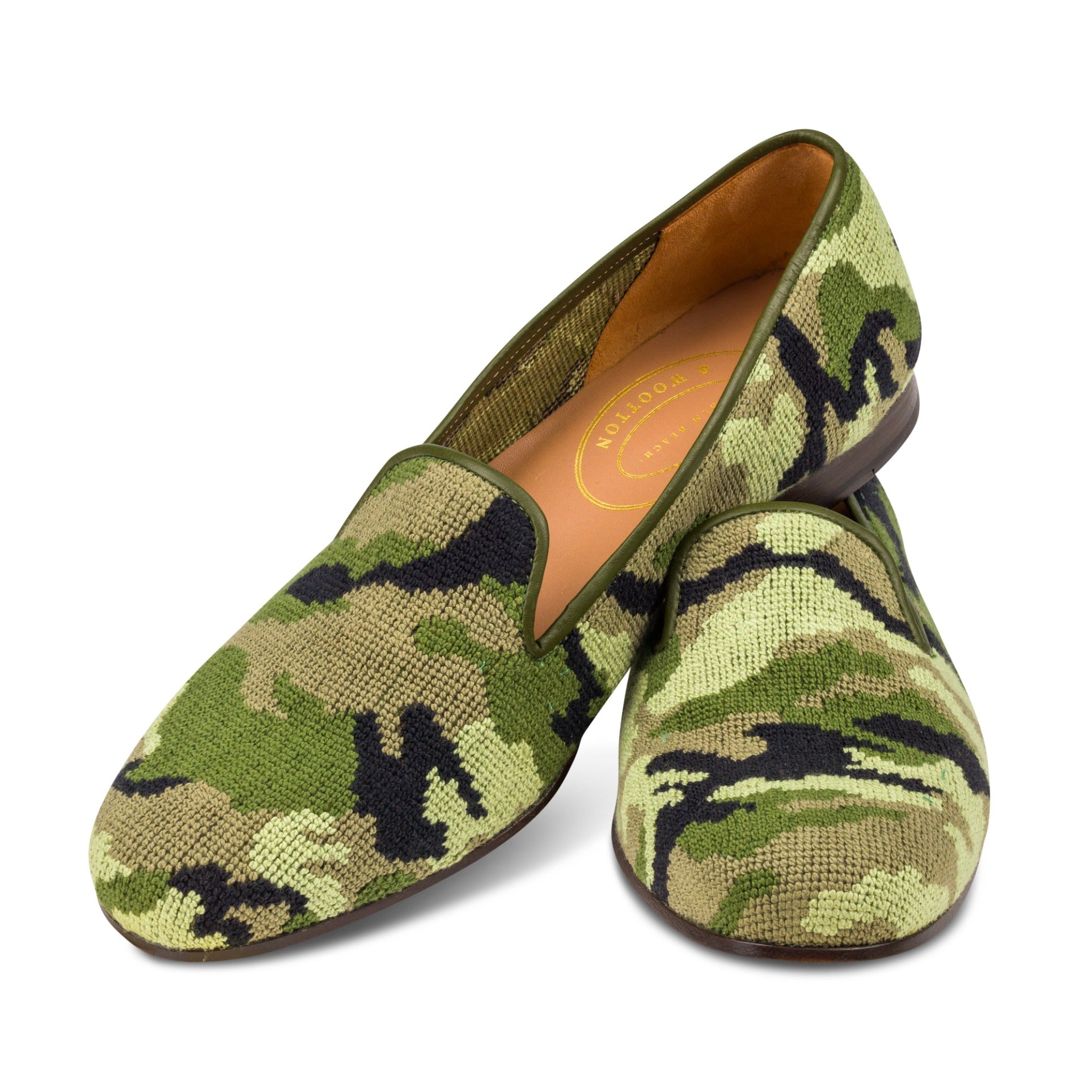 Our Classic Camo Needlepoint Slipper features a Camouflage Patterned Needlepoint Upper with an Olive Green Leather Trim.