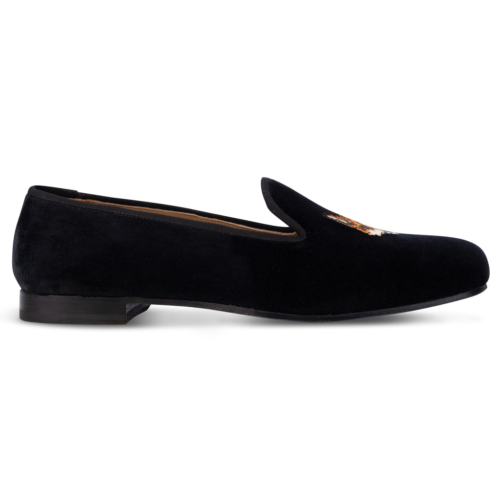 Our Fair Isle Fox velvet slipper is made with our luxurious cotton velvet, and tonal silk cotton grosgrain. The embroidery captures the essence of a knitted pattern in the shape of the mischievous fox over a black ground.