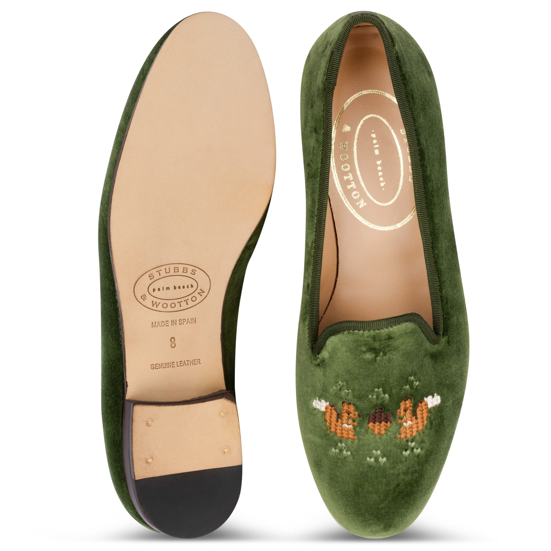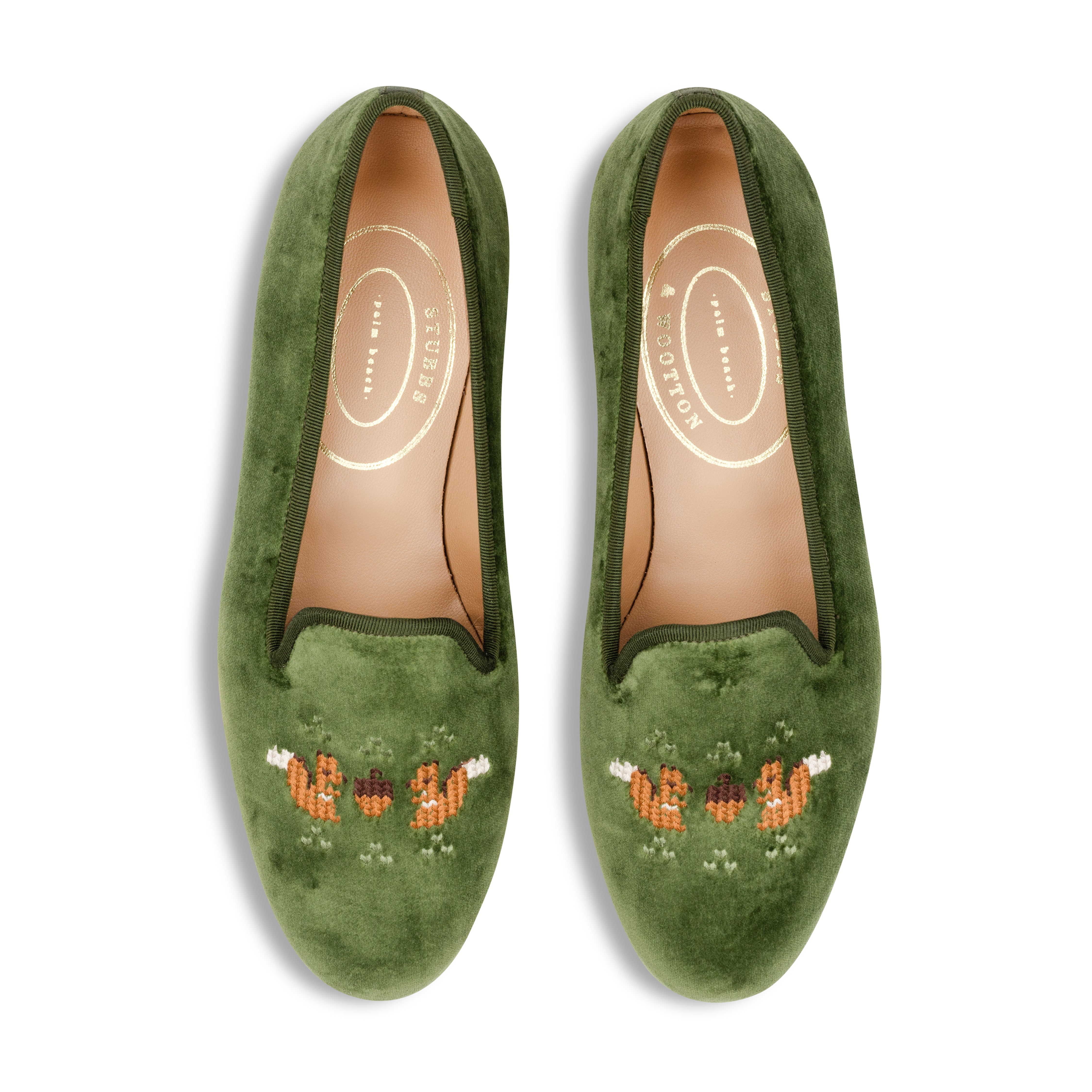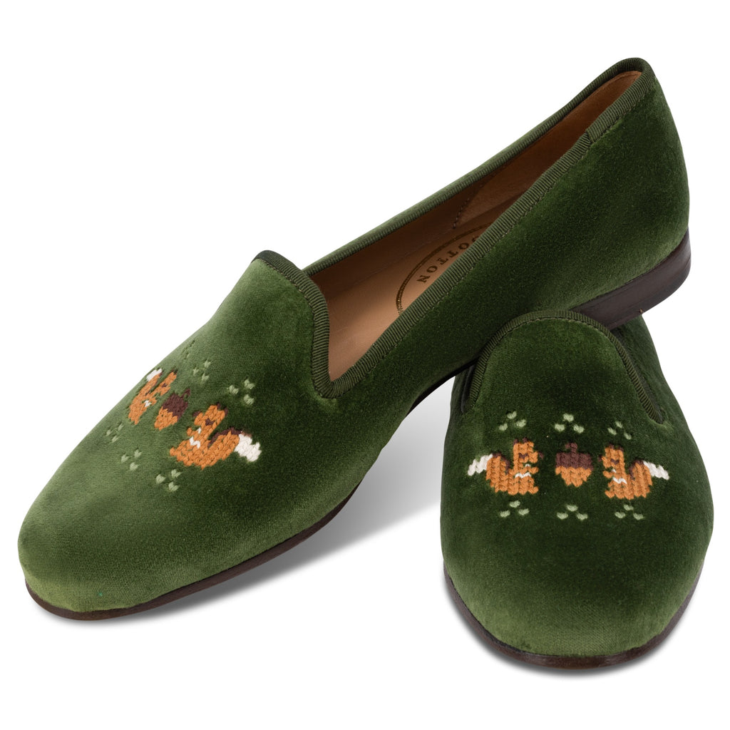 Our Fair Isle Squirrel velvet slipper is made with our luxurious cotton velvet, and tonal silk cotton grosgrain. The embroidery captures the essence of a knitted pattern in the of a curious squirrel over a sage green ground.