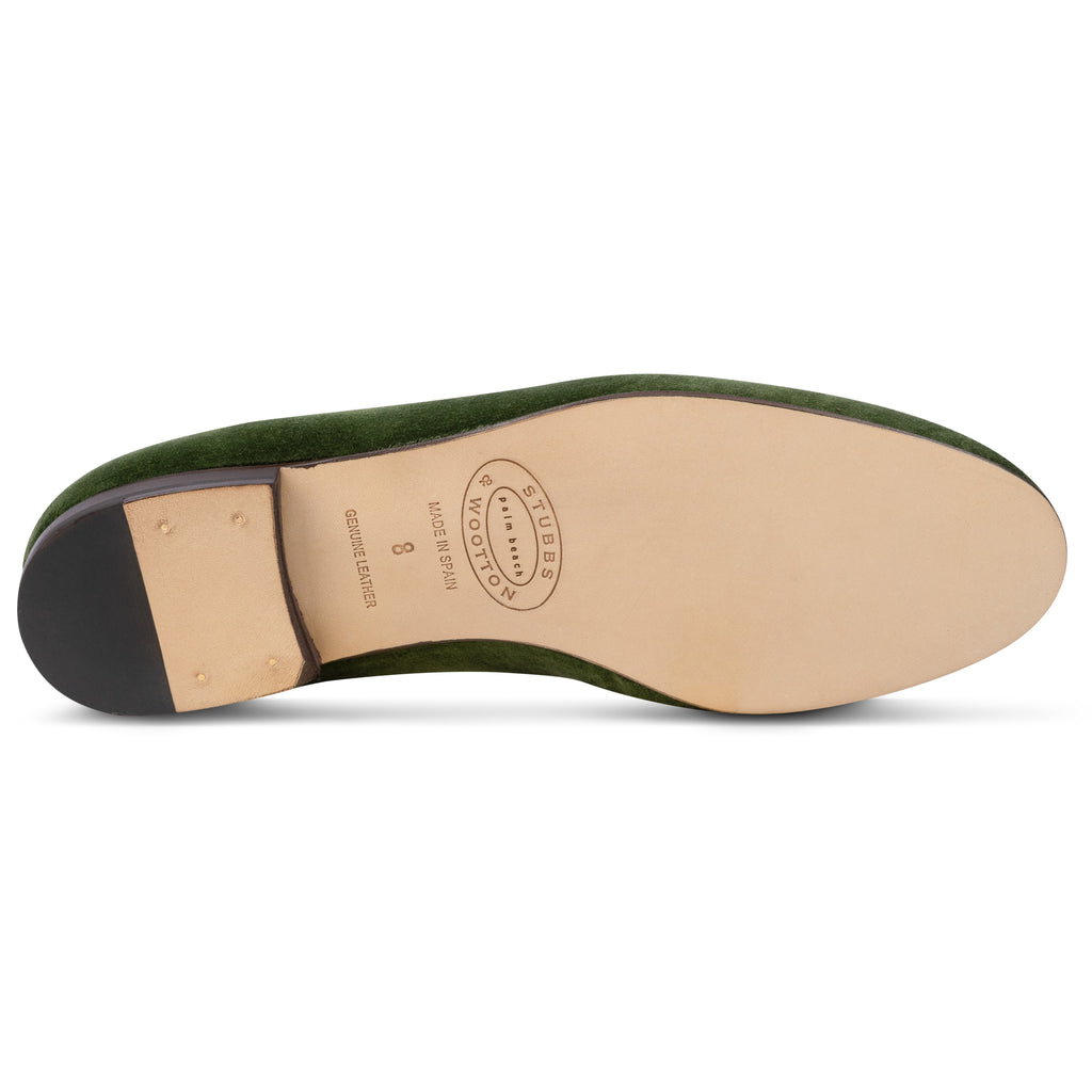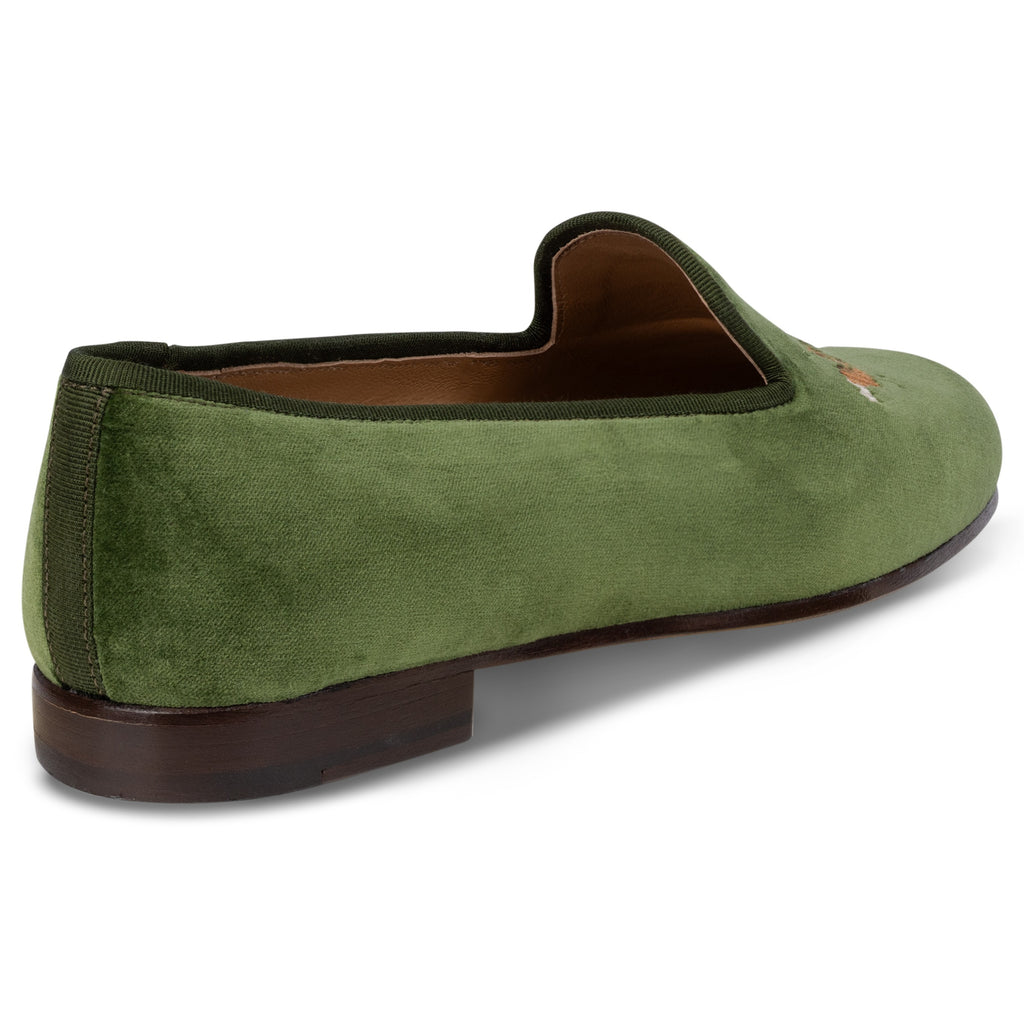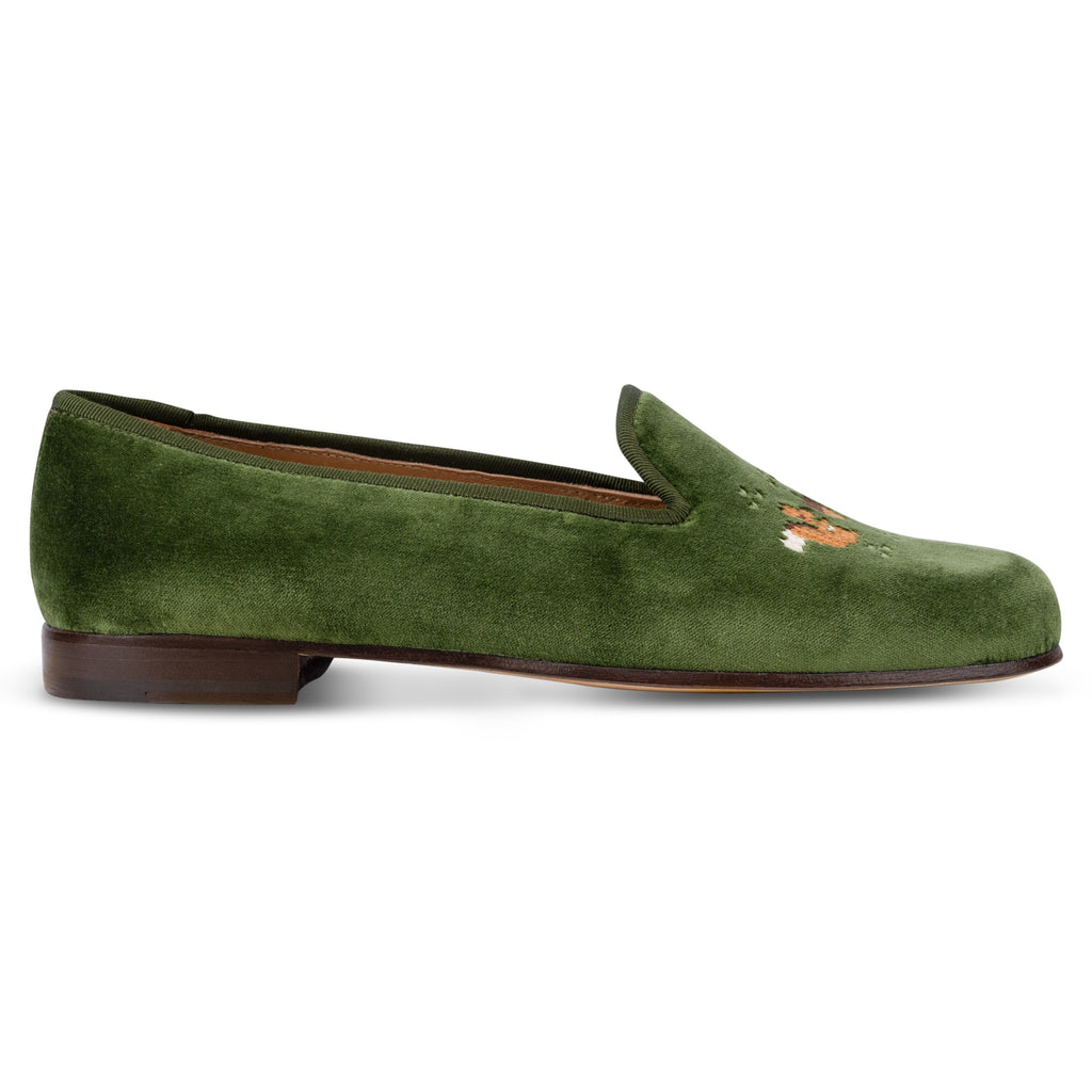 Our Fair Isle Squirrel velvet slipper is made with our luxurious cotton velvet, and tonal silk cotton grosgrain. The embroidery captures the essence of a knitted pattern in the of a curious squirrel over a sage green ground.