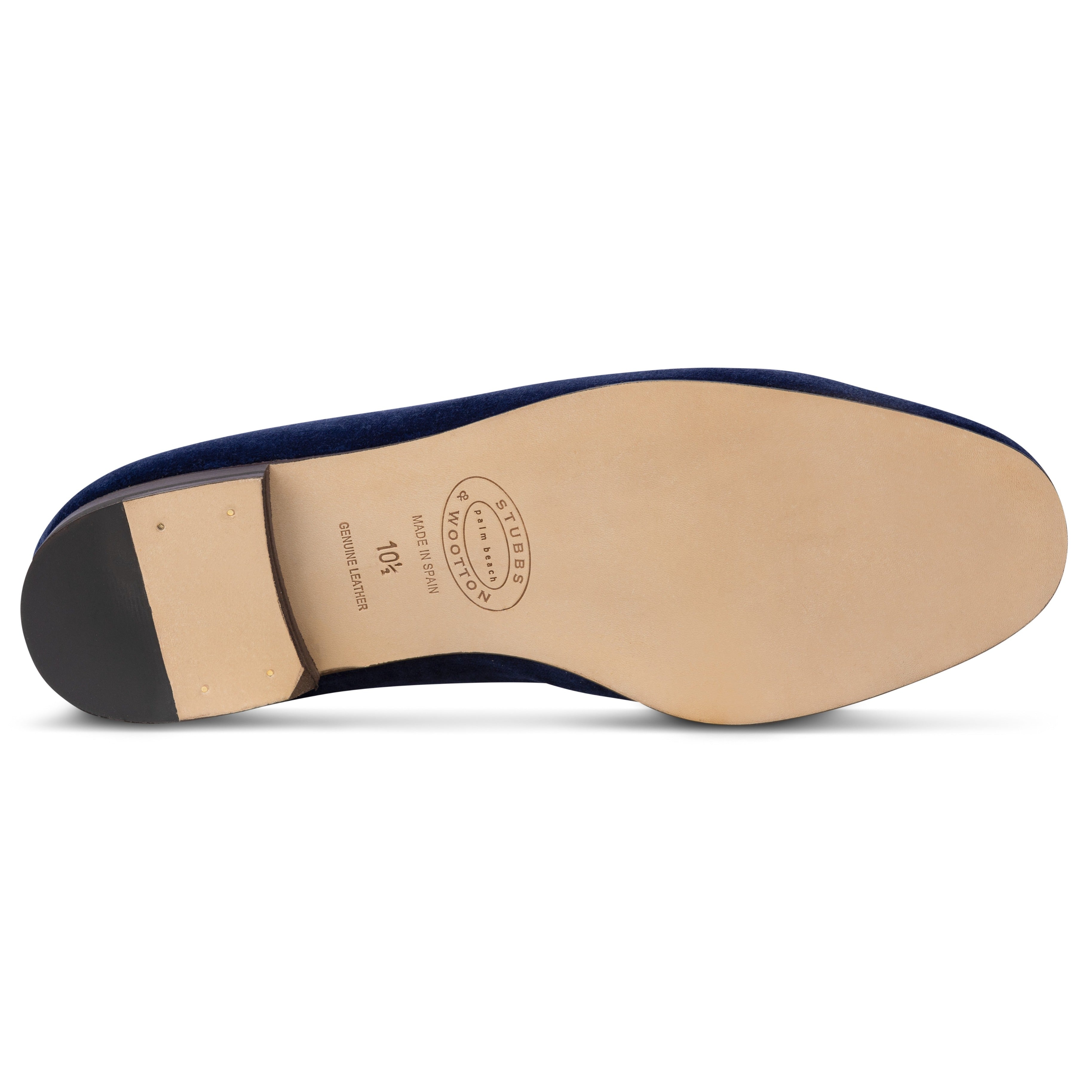 Introducing the Five O' Clock Slipper. Embroidered with a golden pocket watch and chain, and crafted in rich indigo velvet, this style captures the balance of wit and refinement that defines Stubbs & Wootton. Available this weekend only: When the clock strikes five on Sunday, they're gone.