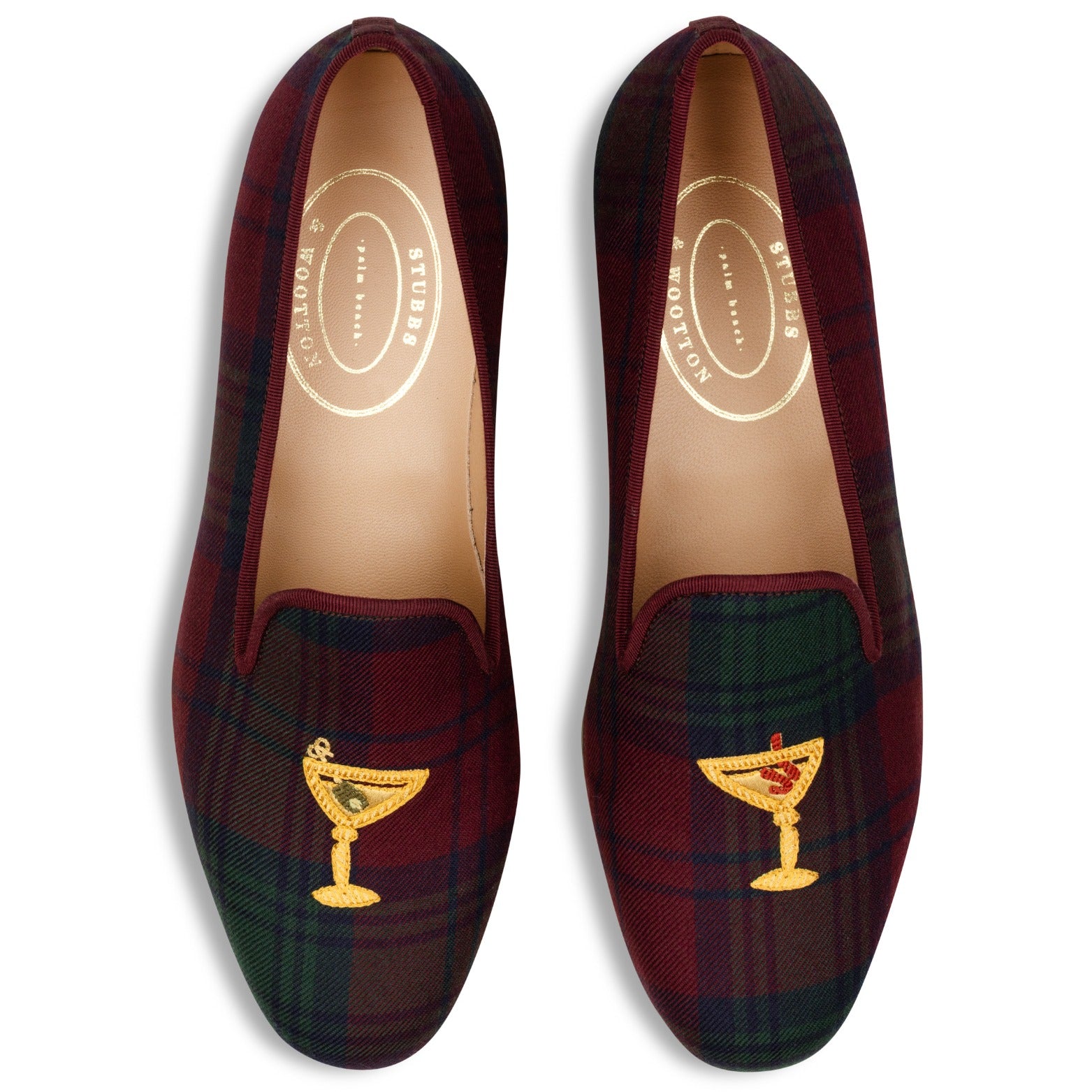 Our Martini tartan slipper is made with English worsted wool, and tonal silk cotton grosgrain. The embroidery is our classic martini reimagined as a hand stitched masterpiece.