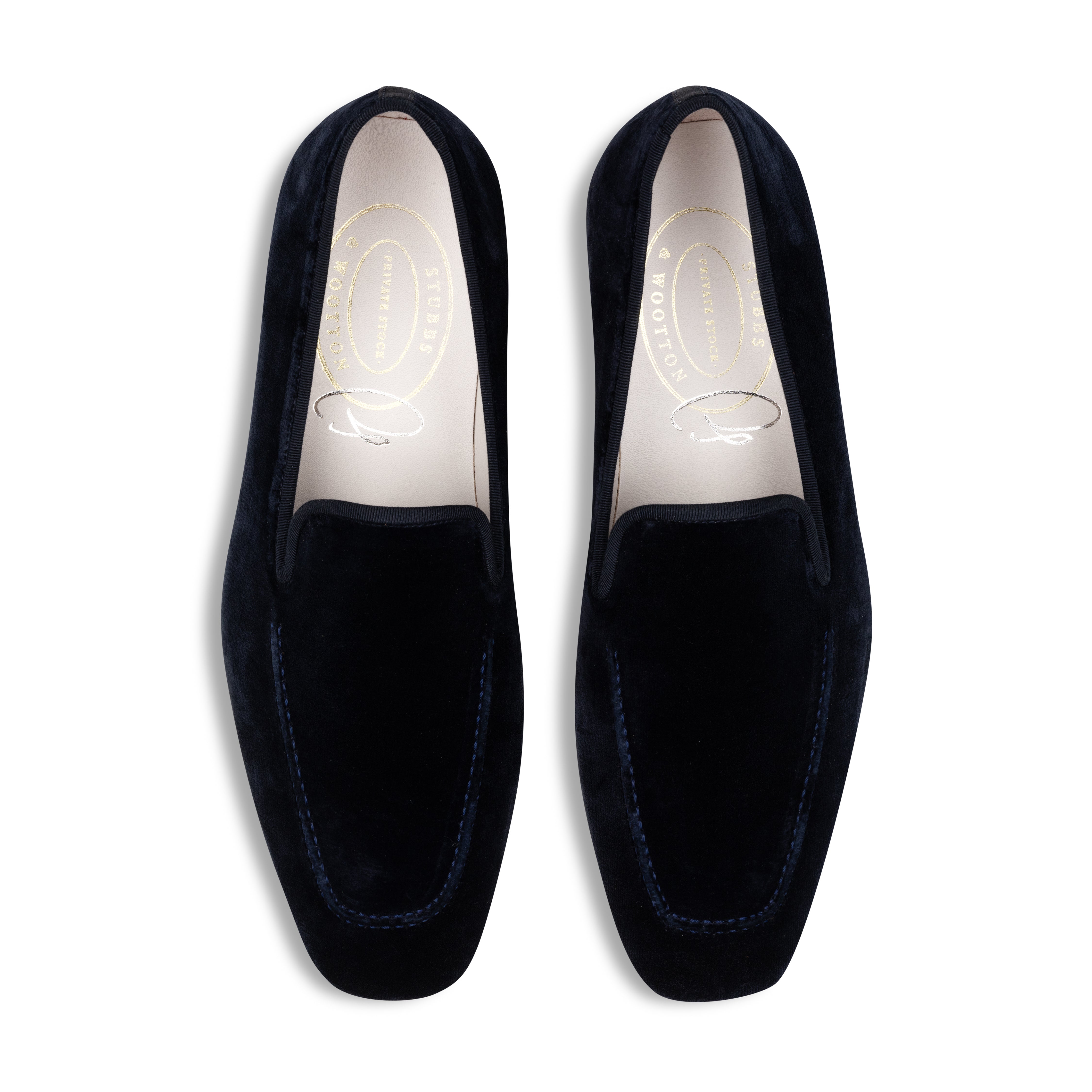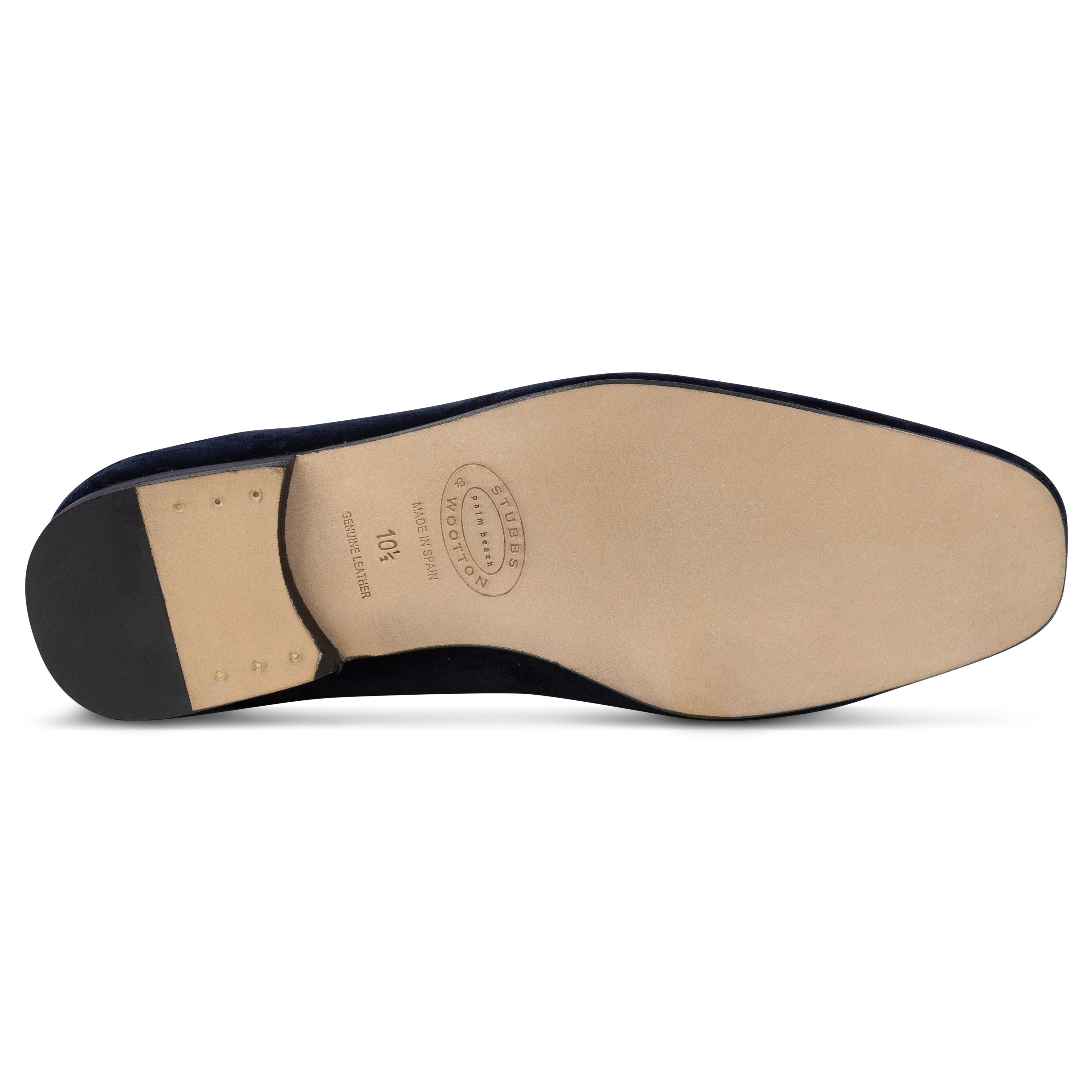 Our midnight velvet Nottingham is made with our luxurious cotton velvet, and tonal silk cotton grosgrain. The Nottingham features our UK cut paired with our venetian stitches across the vamp.