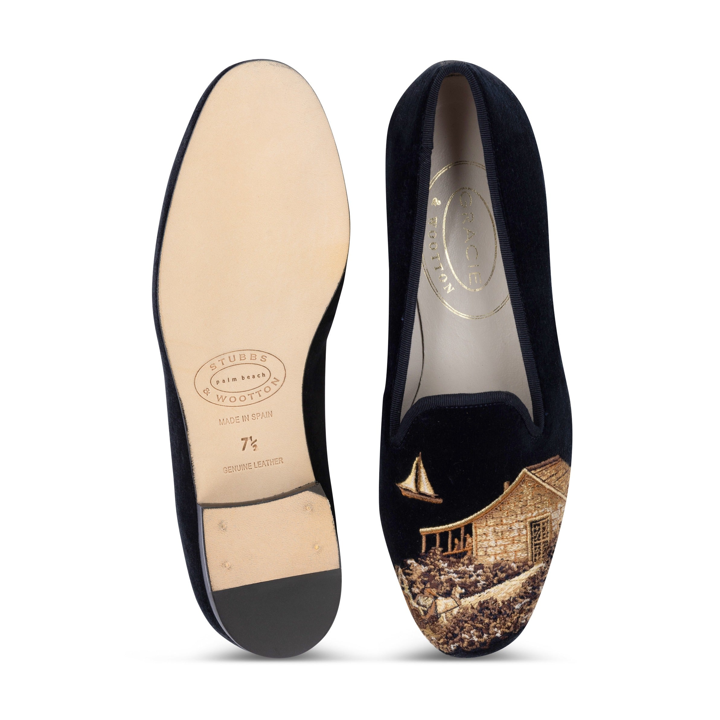 Our Nantucket velvet slipper is made with our luxurious cotton velvet, and tonal silk cotton grosgrain. The embroidery captures a scene of a large sailboat arriving into a harbor in all sepia tones.