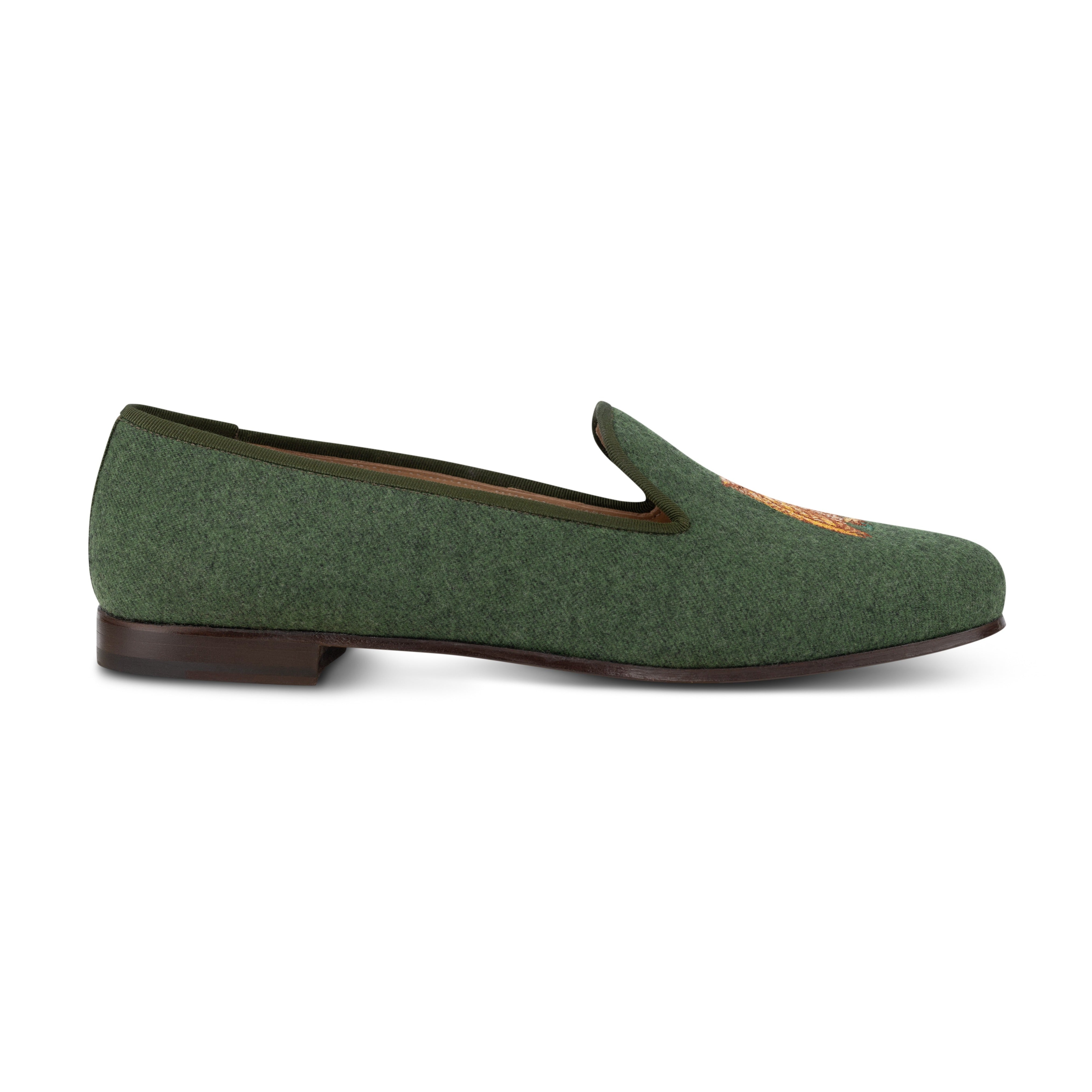 Our Owl loden flannel slipper is made with our cotton wool flannel, and tonal silk cotton grosgrain. The embroidery captures a barn owl in metallic woven cotton threads.