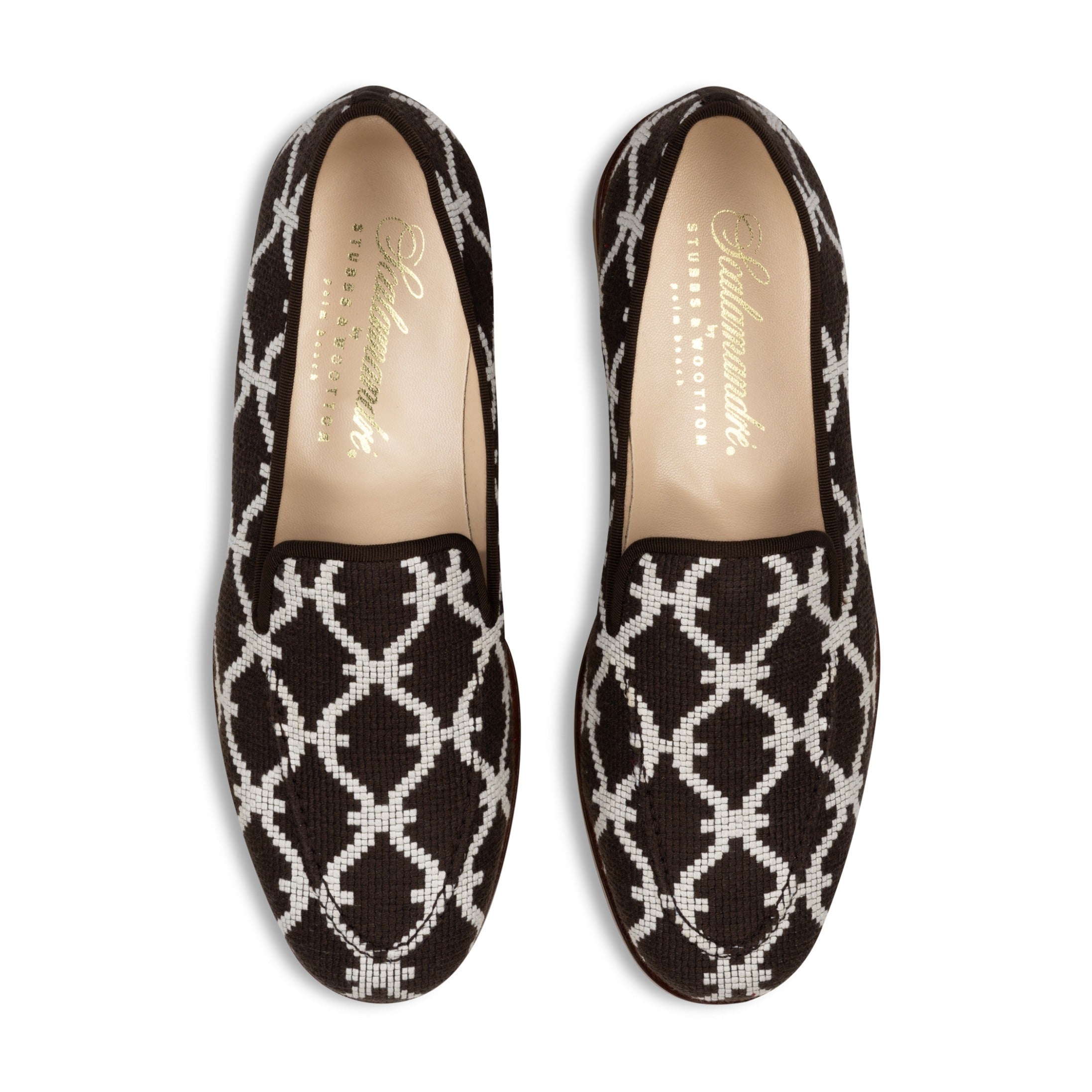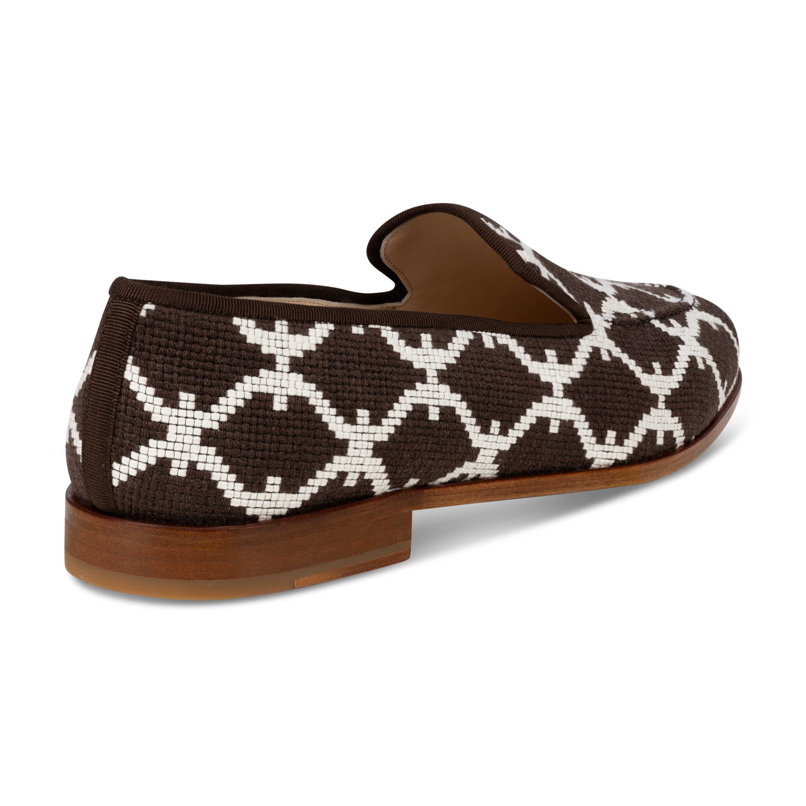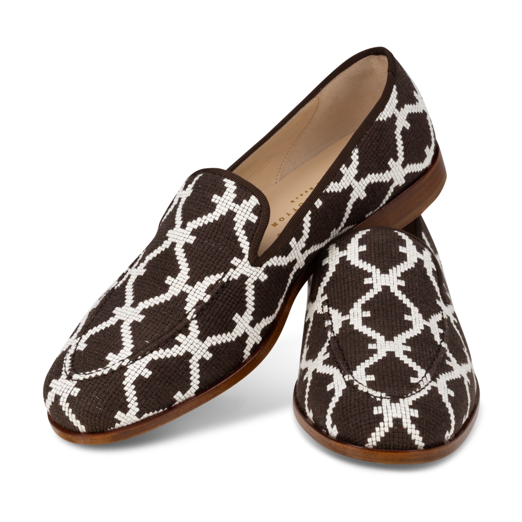 Crafted with Scalamandré's Trellis Weave, the Trellis Venetian brings an elegant interplay of geometry, bridging traditional design with a modern sensibility. Finished with cotton-silk grosgrain trim and set on a stacked black heel, the silhouette feels architectural and effortlessly refined.