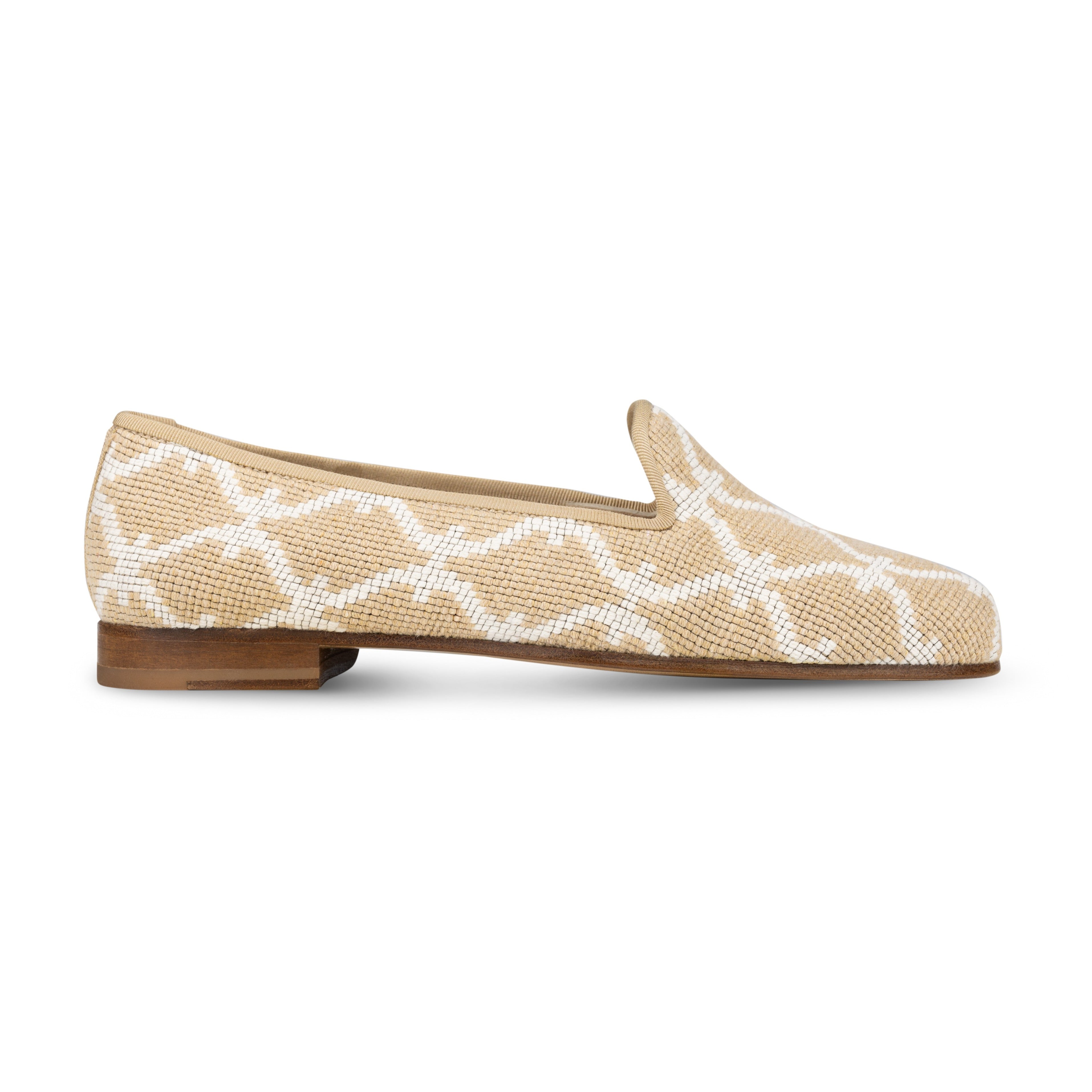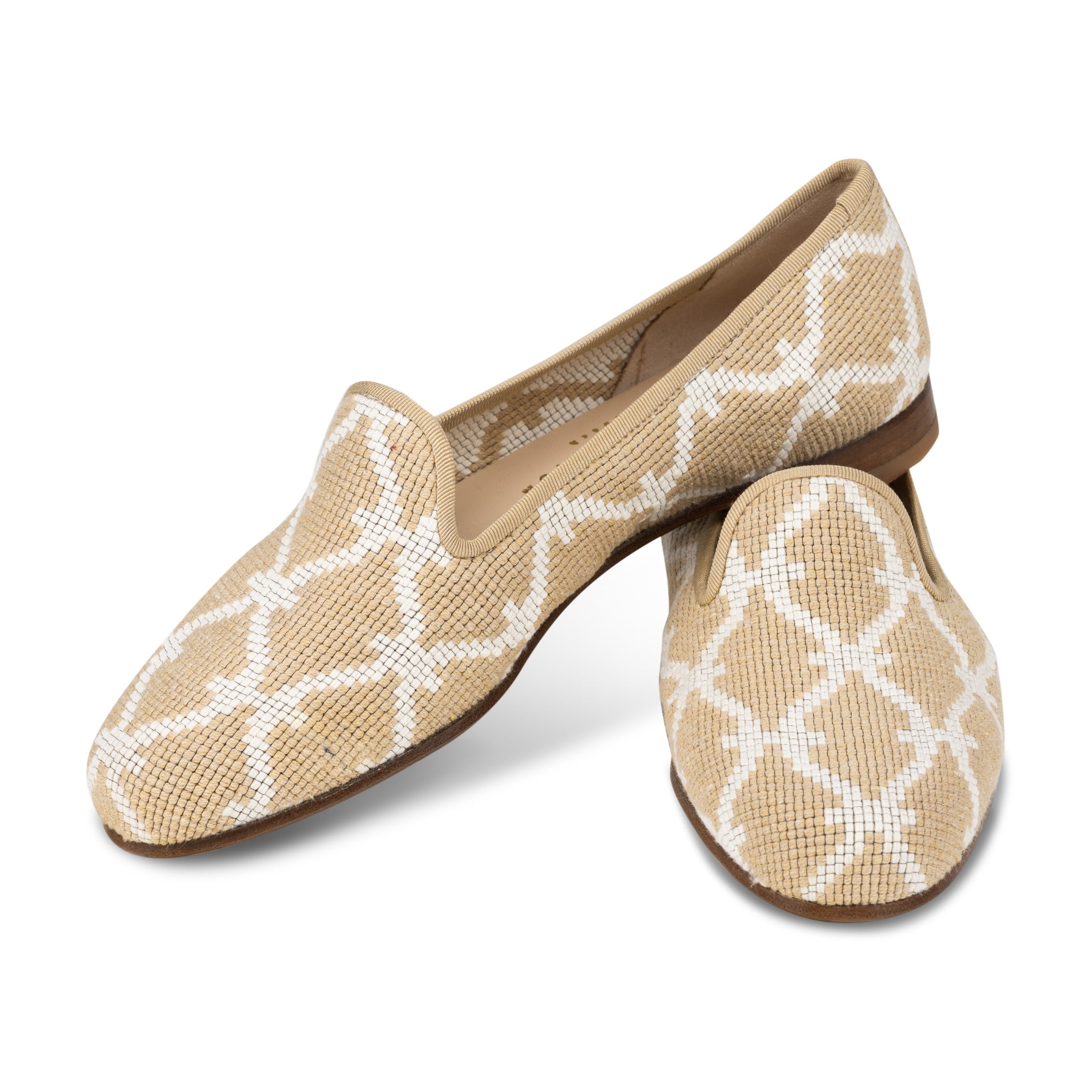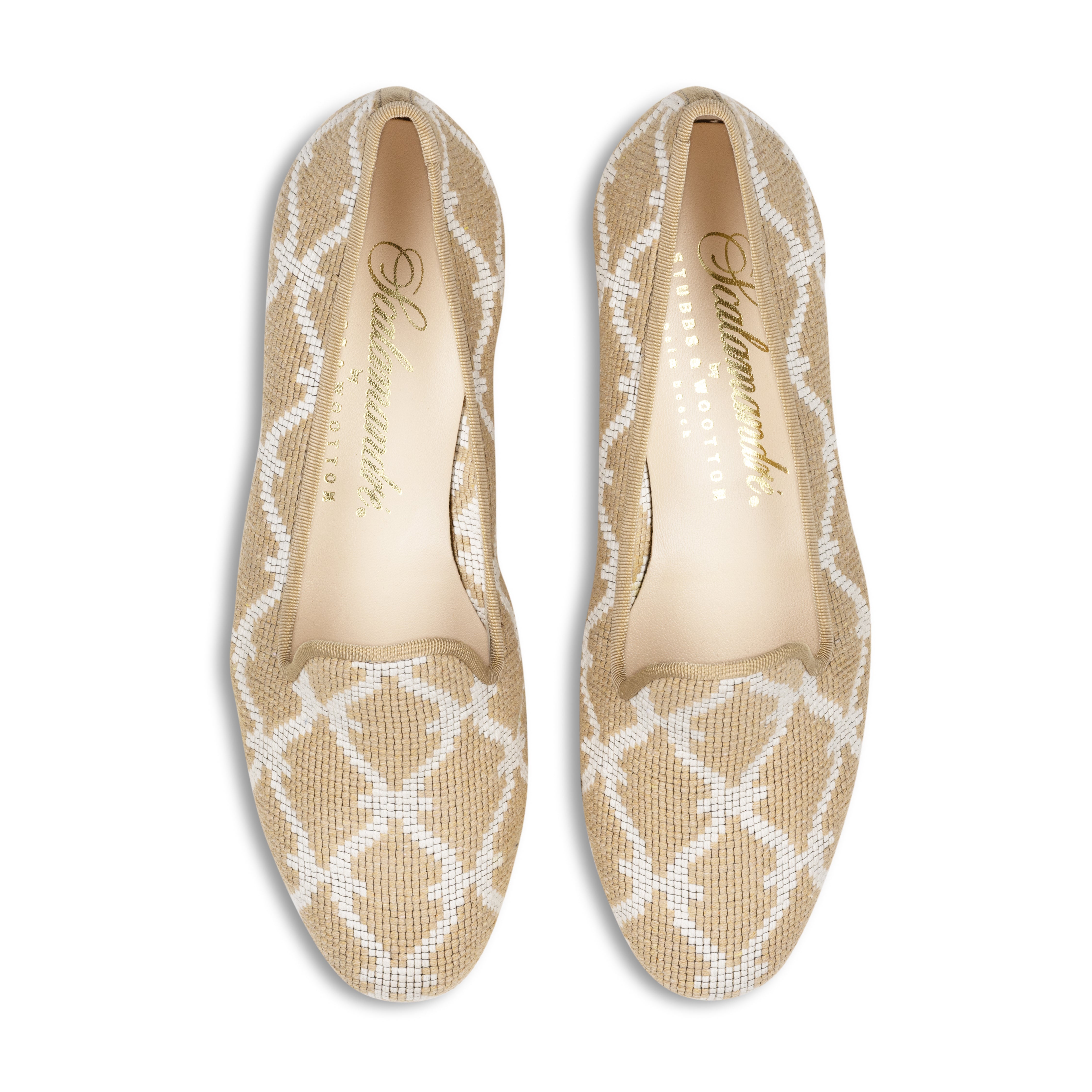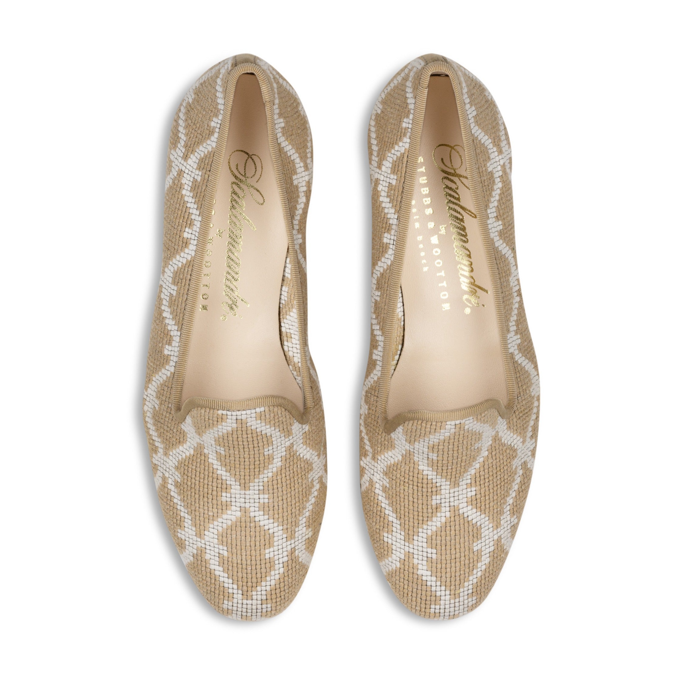 Crafted with Scalamandré's Trellis Weave, the Trellis Slipper brings an elegant interplay of geometry, bridging traditional design with a modern sensibility. Finished with cotton-silk grosgrain trim and set on a stacked black heel, the silhouette feels architectural and effortlessly refined.