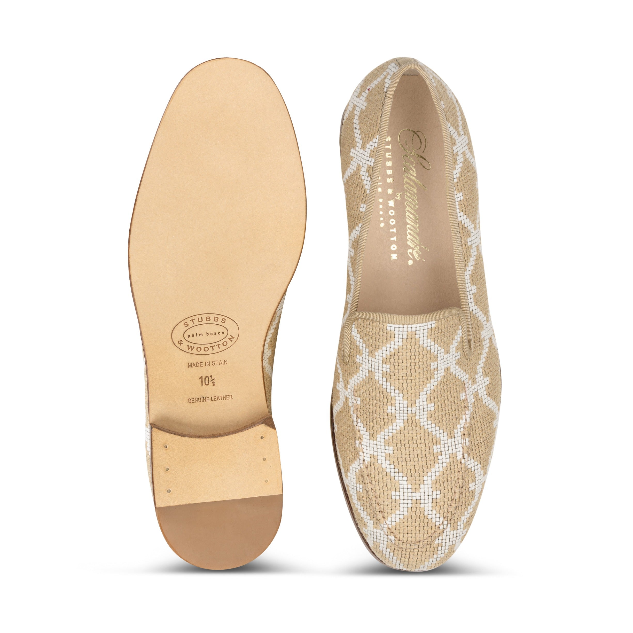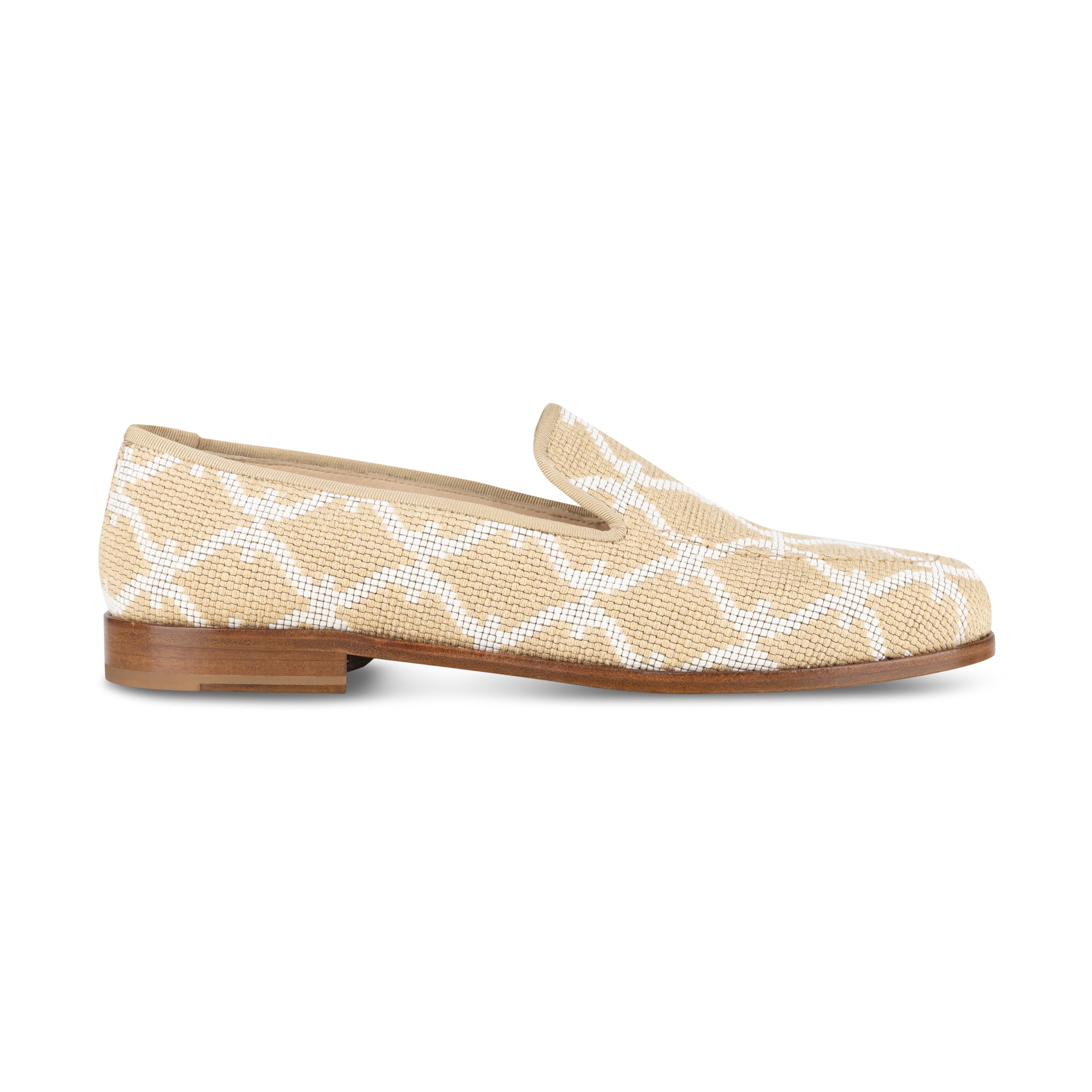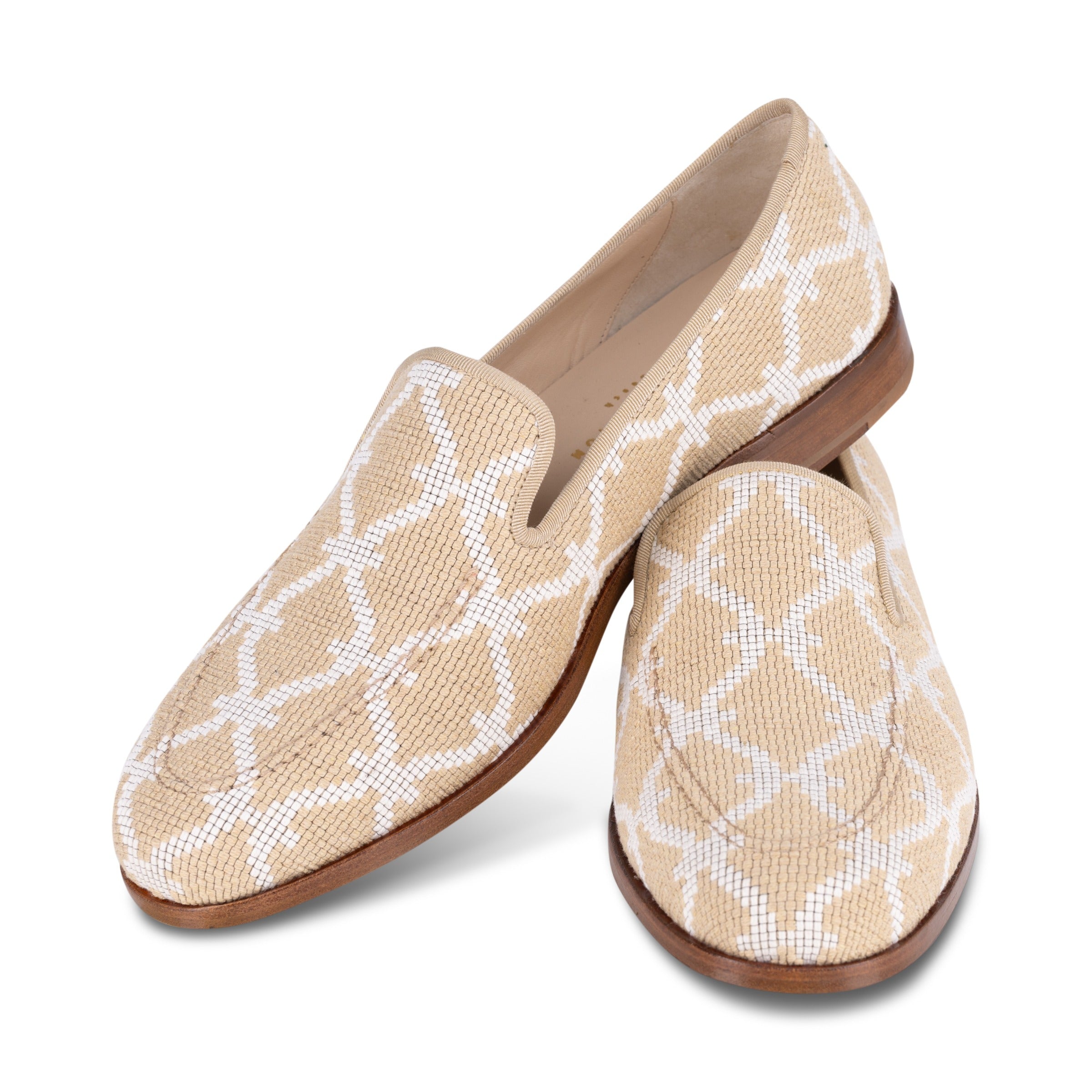 Crafted with Scalamandré's Trellis Weave, the Trellis Venetian brings an elegant interplay of geometry, bridging traditional design with a modern sensibility. Finished with cotton-silk grosgrain trim and set on a stacked black heel, the silhouette feels architectural and effortlessly refined.